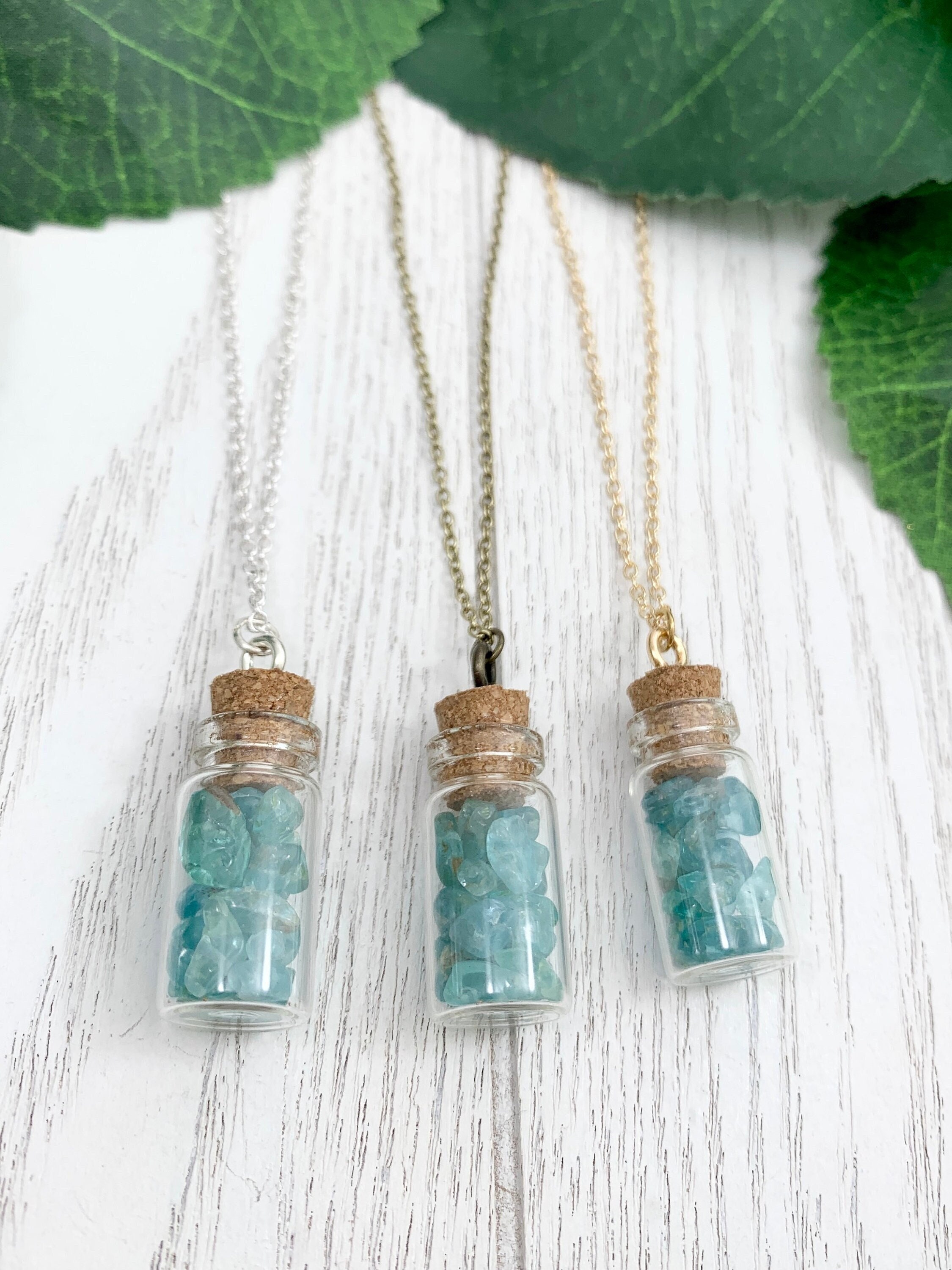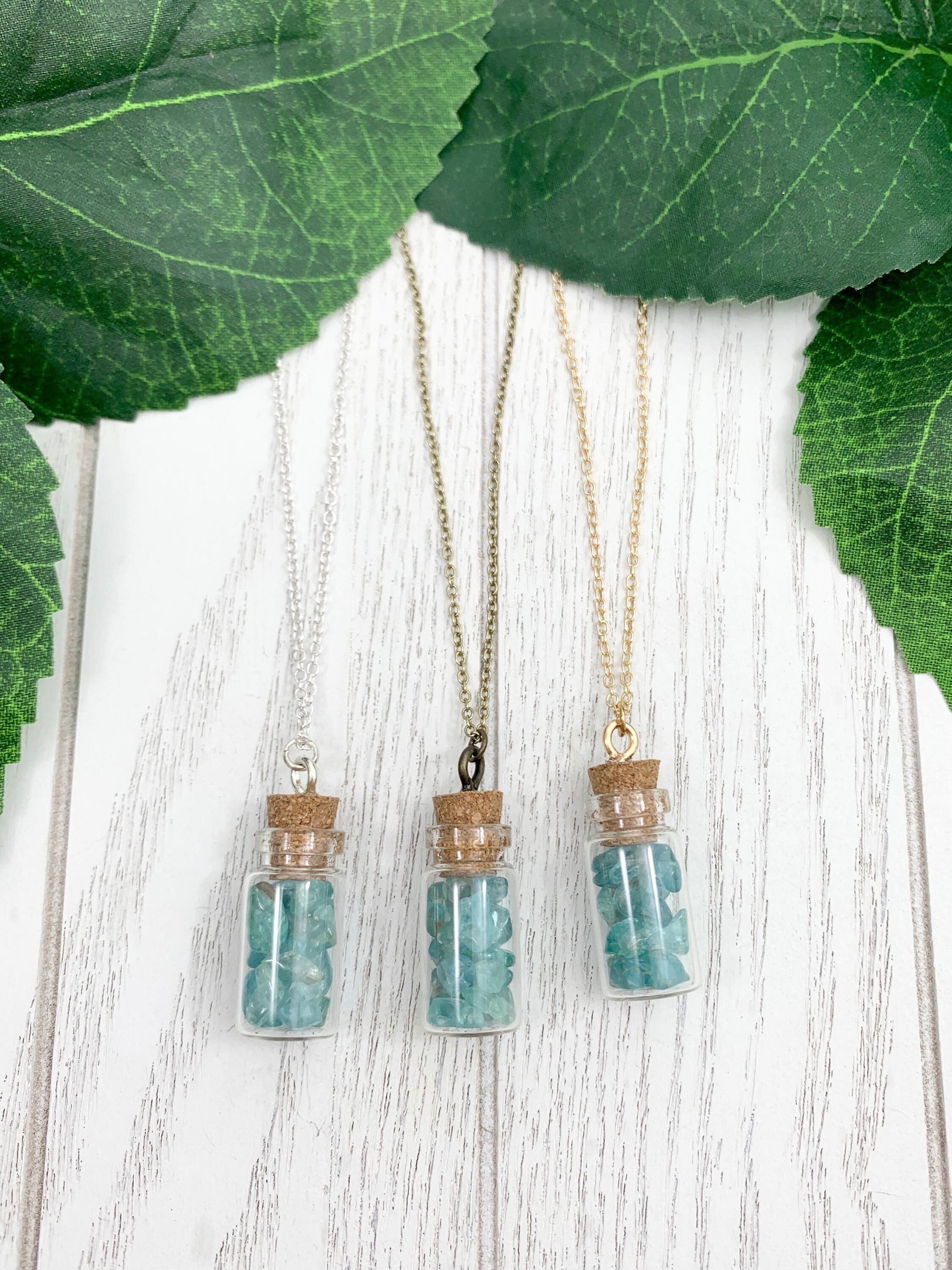 1.5-inch glass bottle filled with vibrant blue apatite chips, sealed with cork, on a delicate gold, antique gold or silver chain.