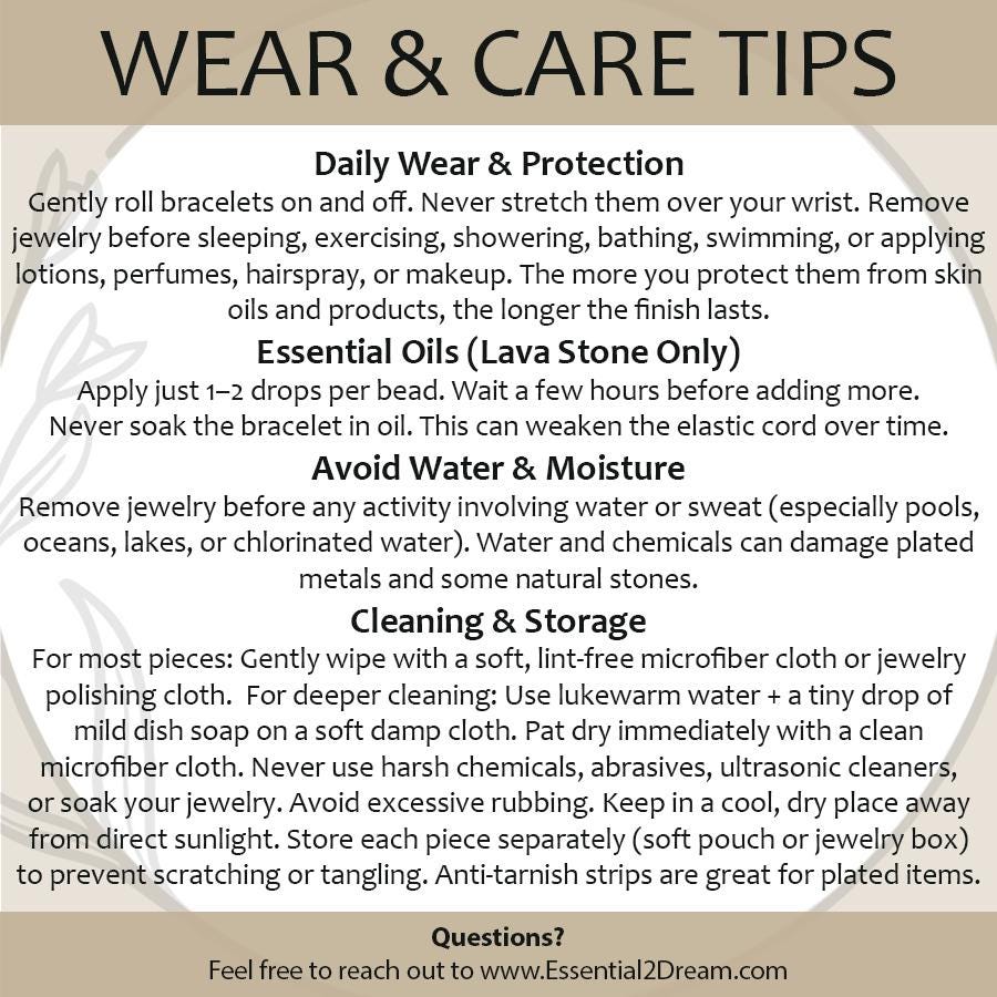 Remember the five S's - DO NOT Sleep, Sweat, Shower, Spray (Perfumes/Lotions) or Swim with jewelry on. Moisture can cause damage over time. Salt water is a great way to say goodbye. Exception: essential oil diffuser jewelry is made for essential oils only.