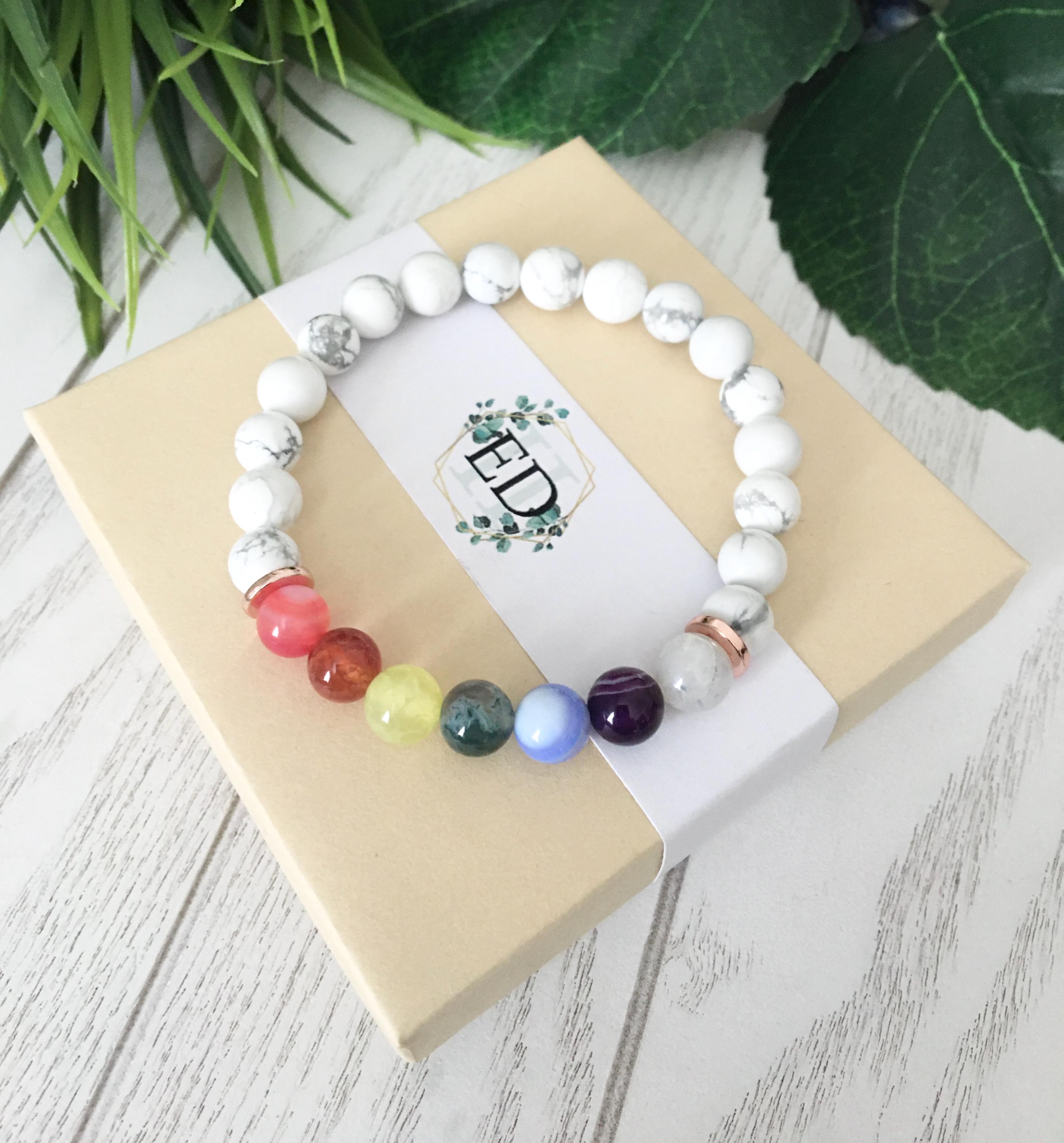 Polished 8 mm chakra agate beads strung on durable elastic fiber, interspersed with your choice of beads and metal spacers.