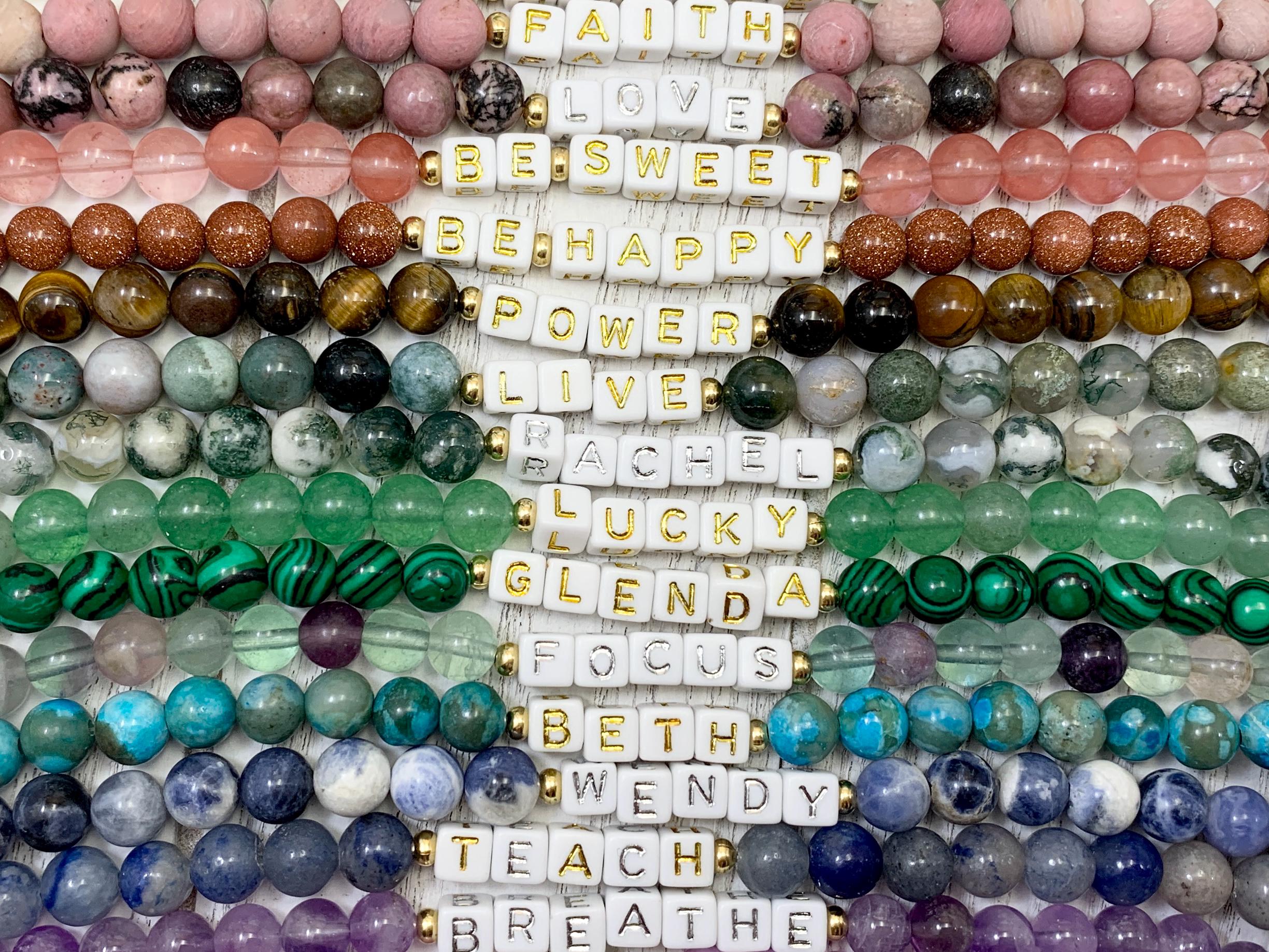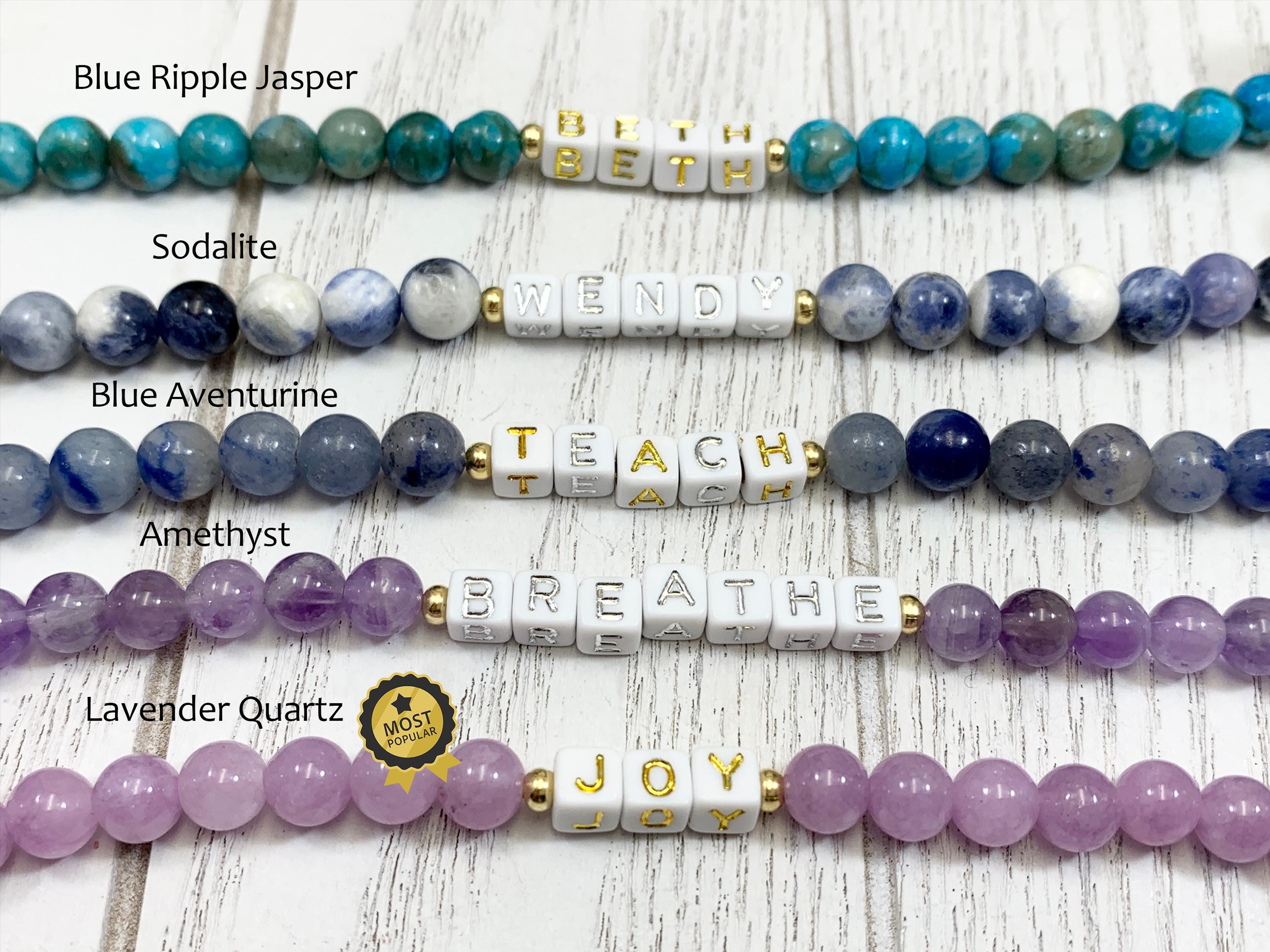 A perfect dainty elastic gemstone word bracelet. Gorgeous 6mm gemstone crystals on a personalized elastic stretch bracelet with your choice letter beads in between tiny round 3mm gold metal spacer beads. Spell out a name, word or short message on a custom letter bracelet. Choose between silver or gold metallic lettering on these cute white acrylic cube alphabet beads.