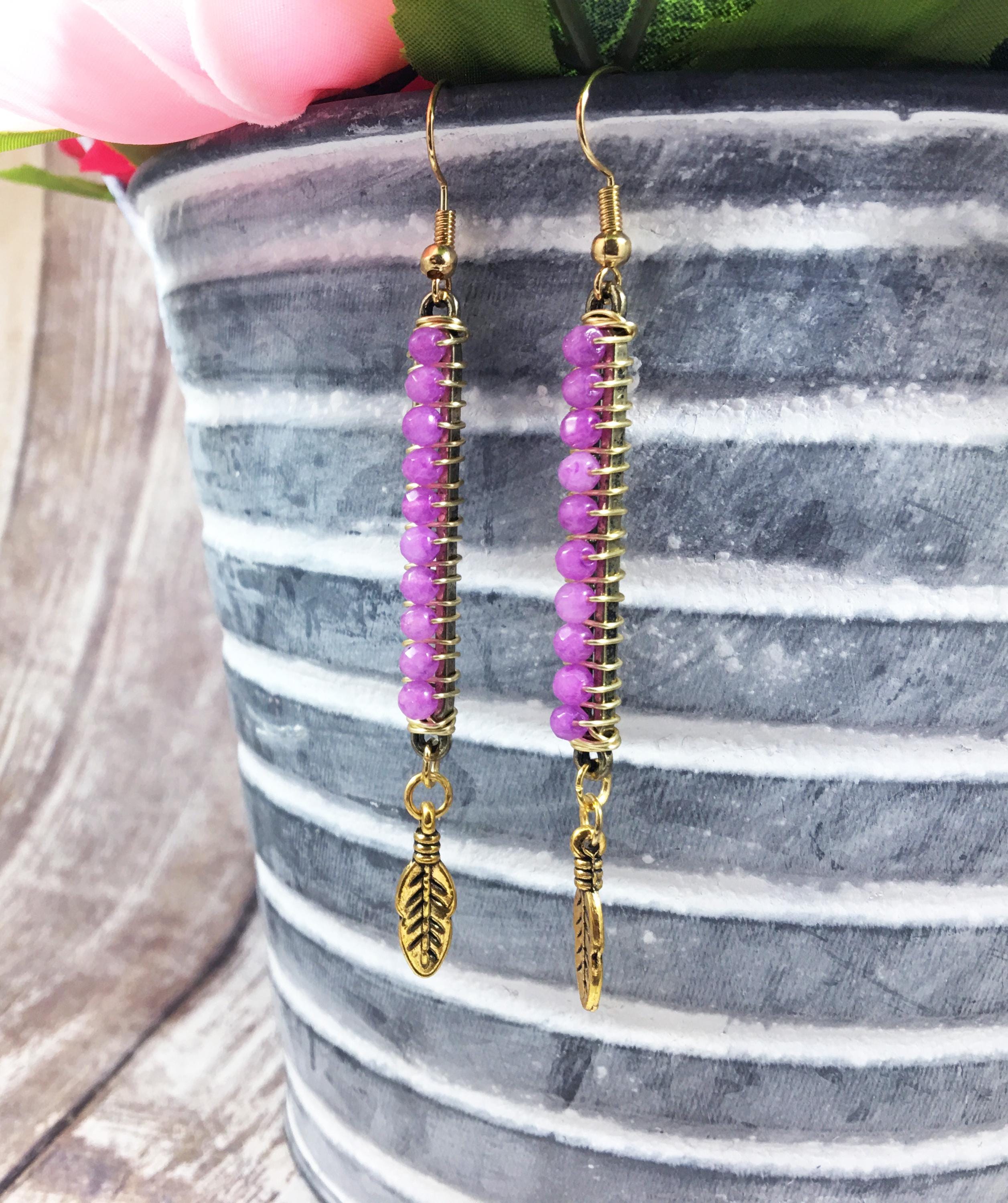 These Purple Agate Boho Earrings feature 3 mm faceted purple agate beads wire-wrapped on elegant connectors, finishing with delicate feather charms: a wearable blend for strength, beauty, and spiritual style.