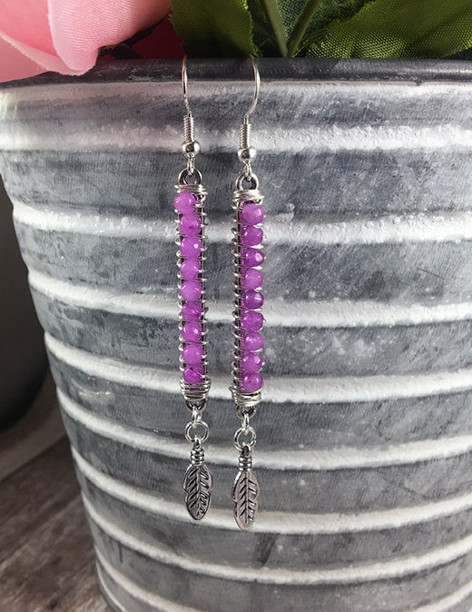 3 mm faceted purple agate beads, wire-wrapped on a vertical connector, ending in a feather charm.