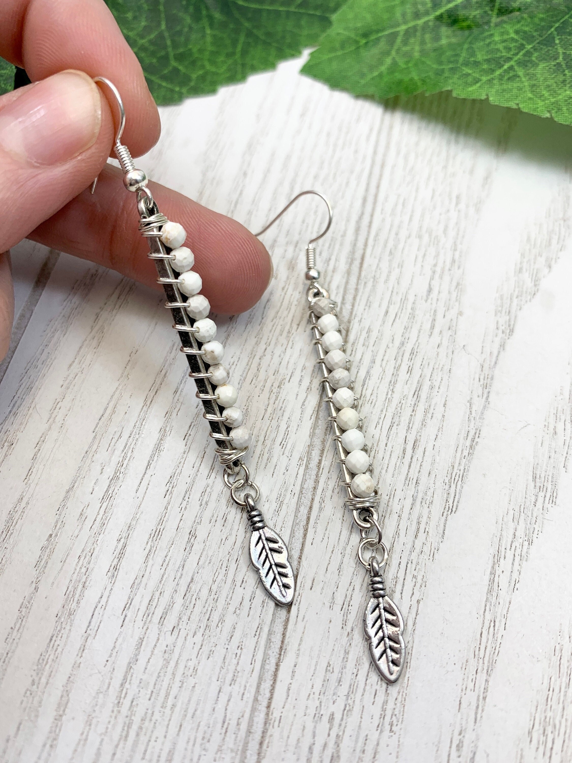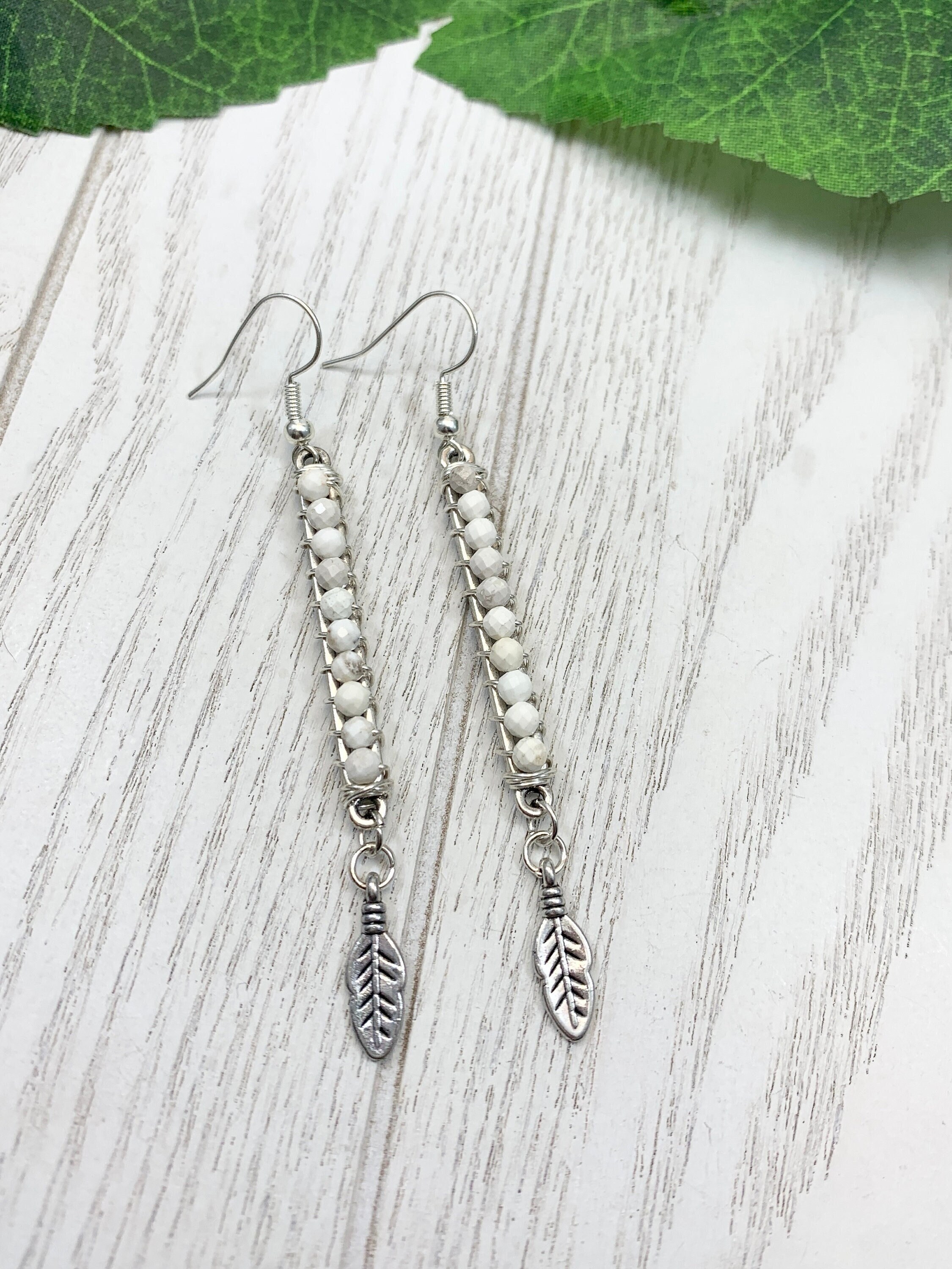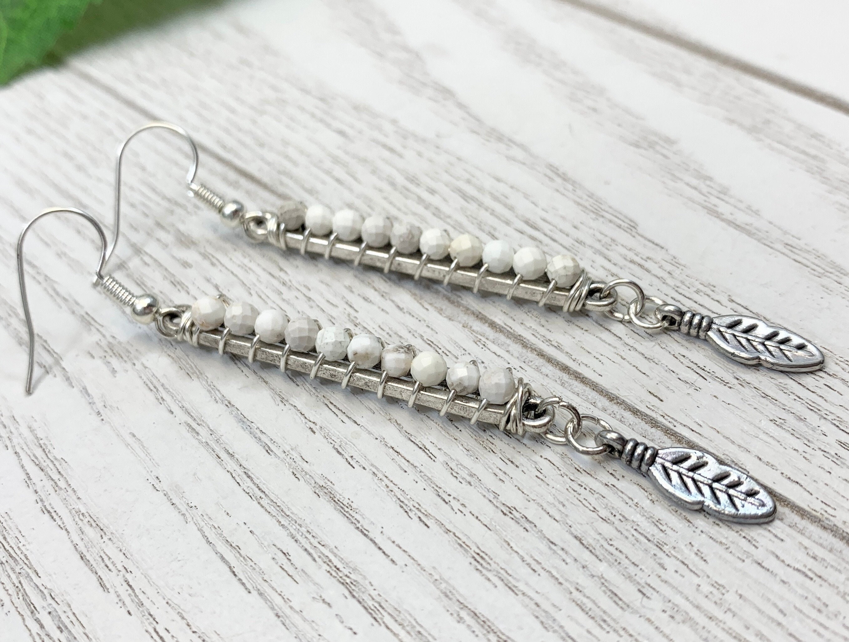 Stones & Charms: Polished faceted white howlite (3-4 mm) with feather dangles on hypoallergenic ear wires.