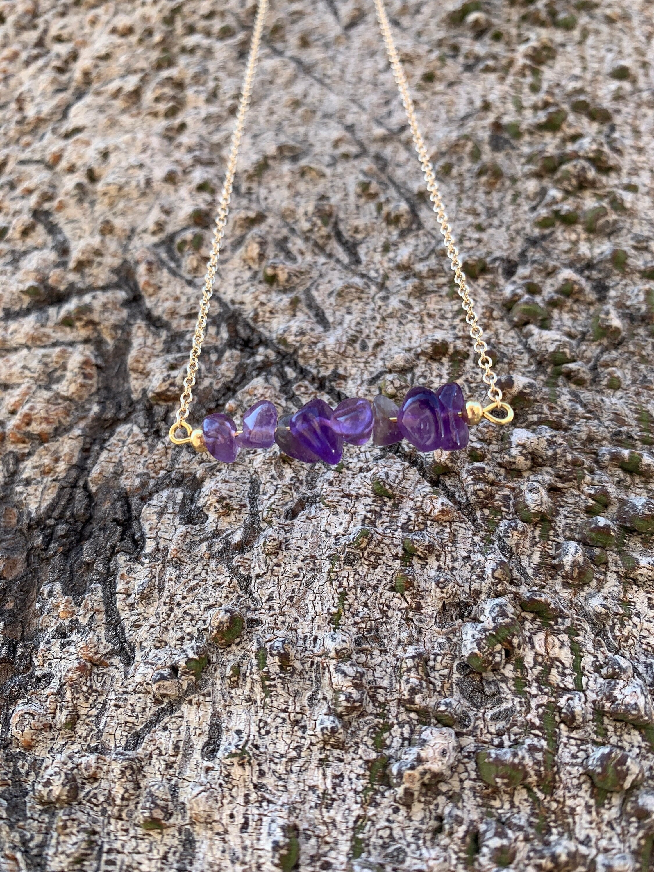 This Dainty Gold Amethyst Chip Necklace features tiny polished amethyst chips on a delicate gold chain. Crafted to remind you of clarity, serenity and subtle strength.