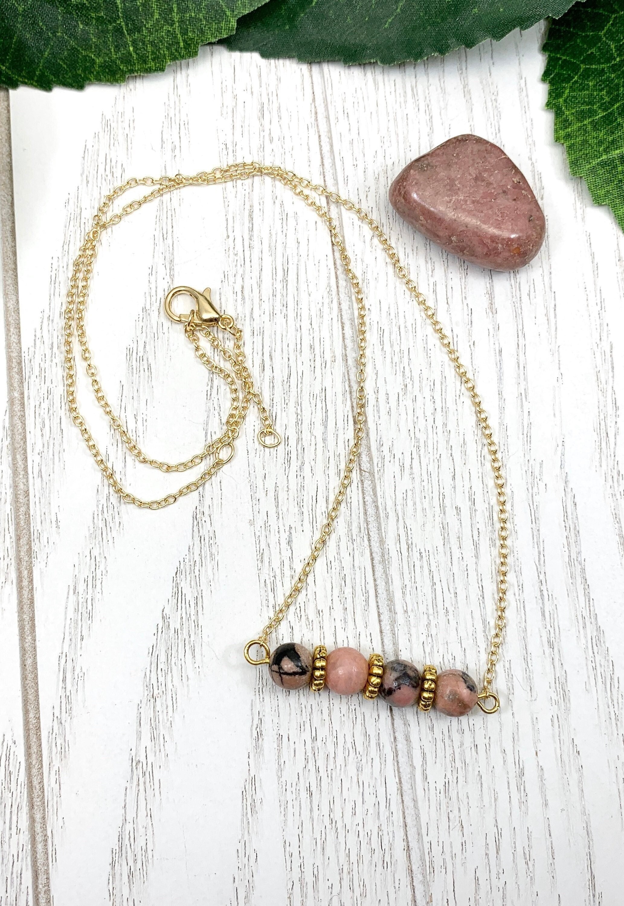 Natural Variation: Every rhodonite bar shows its own unique pink tone and black matrix. Your necklace is uniquely yours.