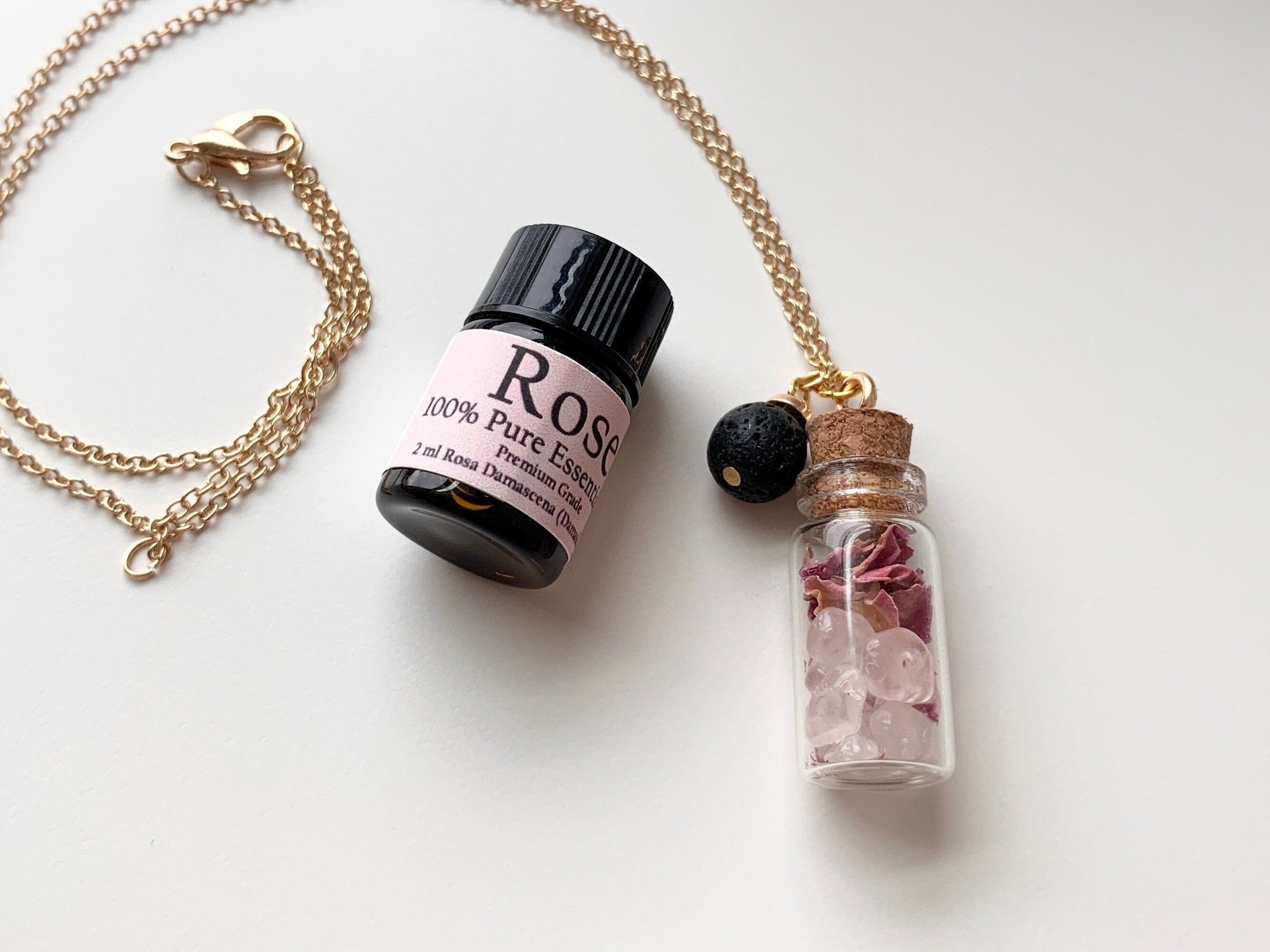 Glass vial (1.25″) filled with rose quartz chips + dried rose petals, accented with an 8 mm lava stone diffuser bead, hung on your choice of metal chain (silver, gold, antique).