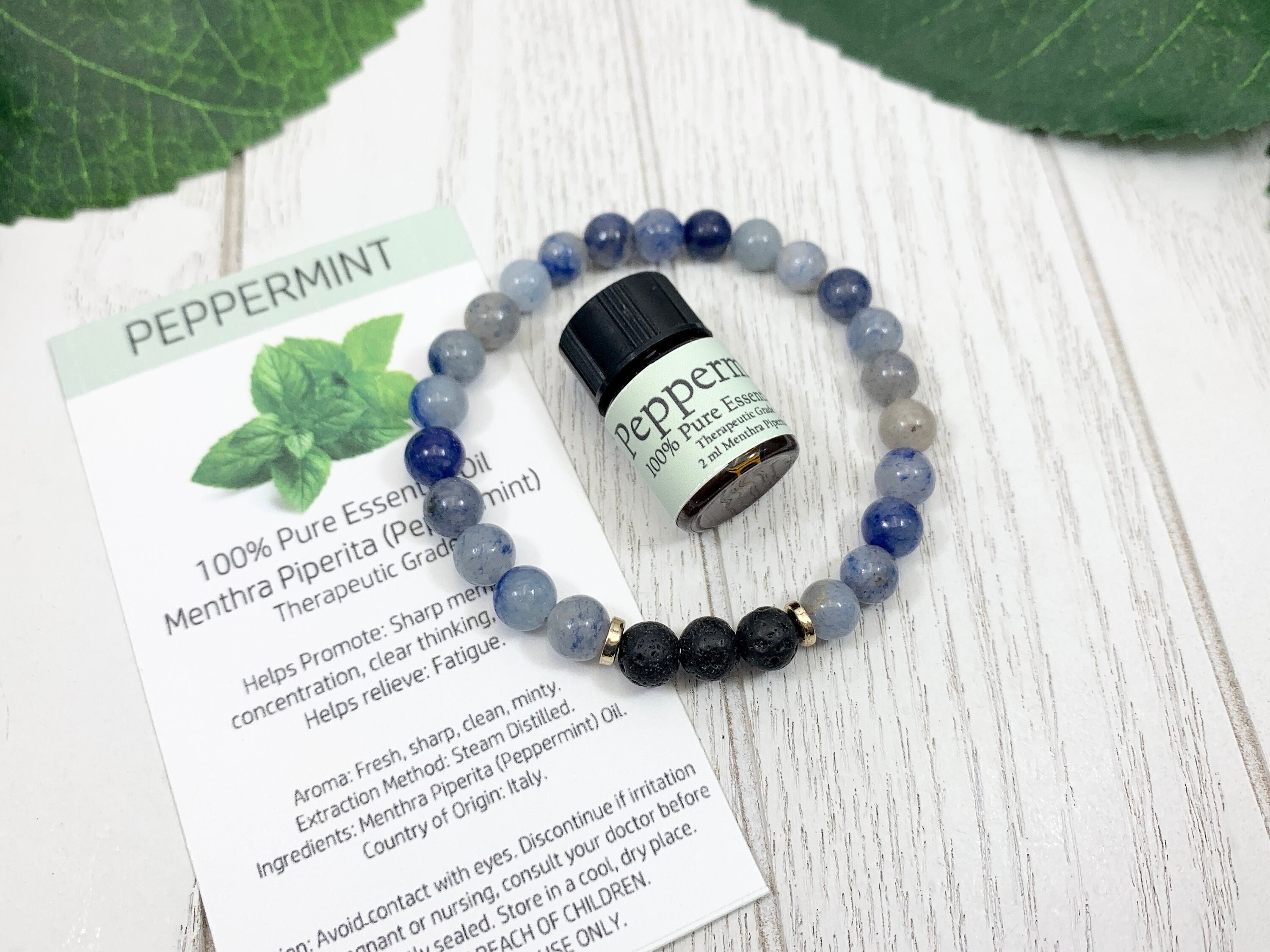 Polished 6 mm blue aventurine beads strung on durable elastic fiber, interspersed with lava rock diffuser beads and your choice of metal spacers.