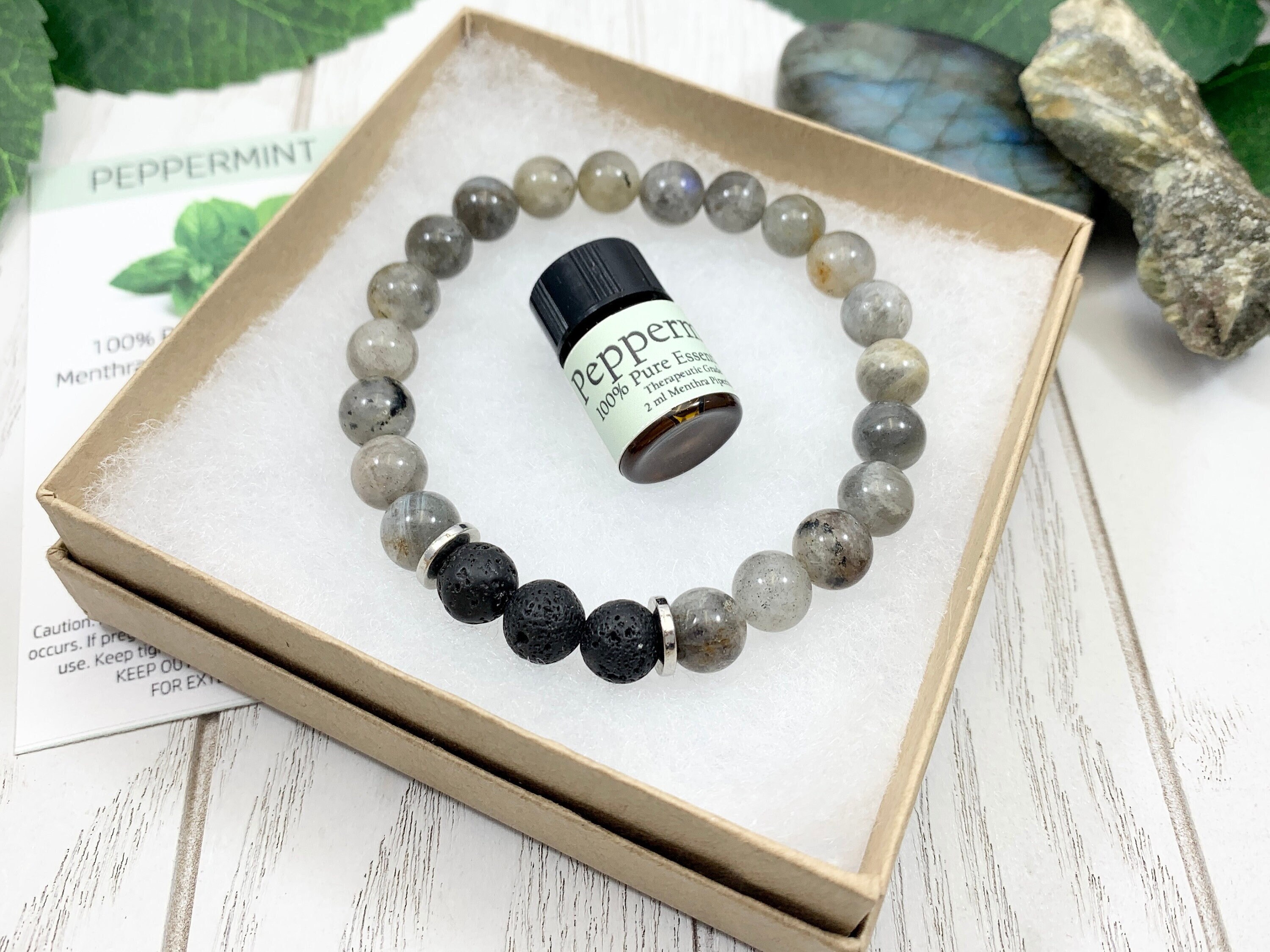 Polished 8 mm labradorite beads strung on durable elastic fiber, interspersed with lava rock diffuser beads and your choice of metal spacers (gold, silver, or rose gold).