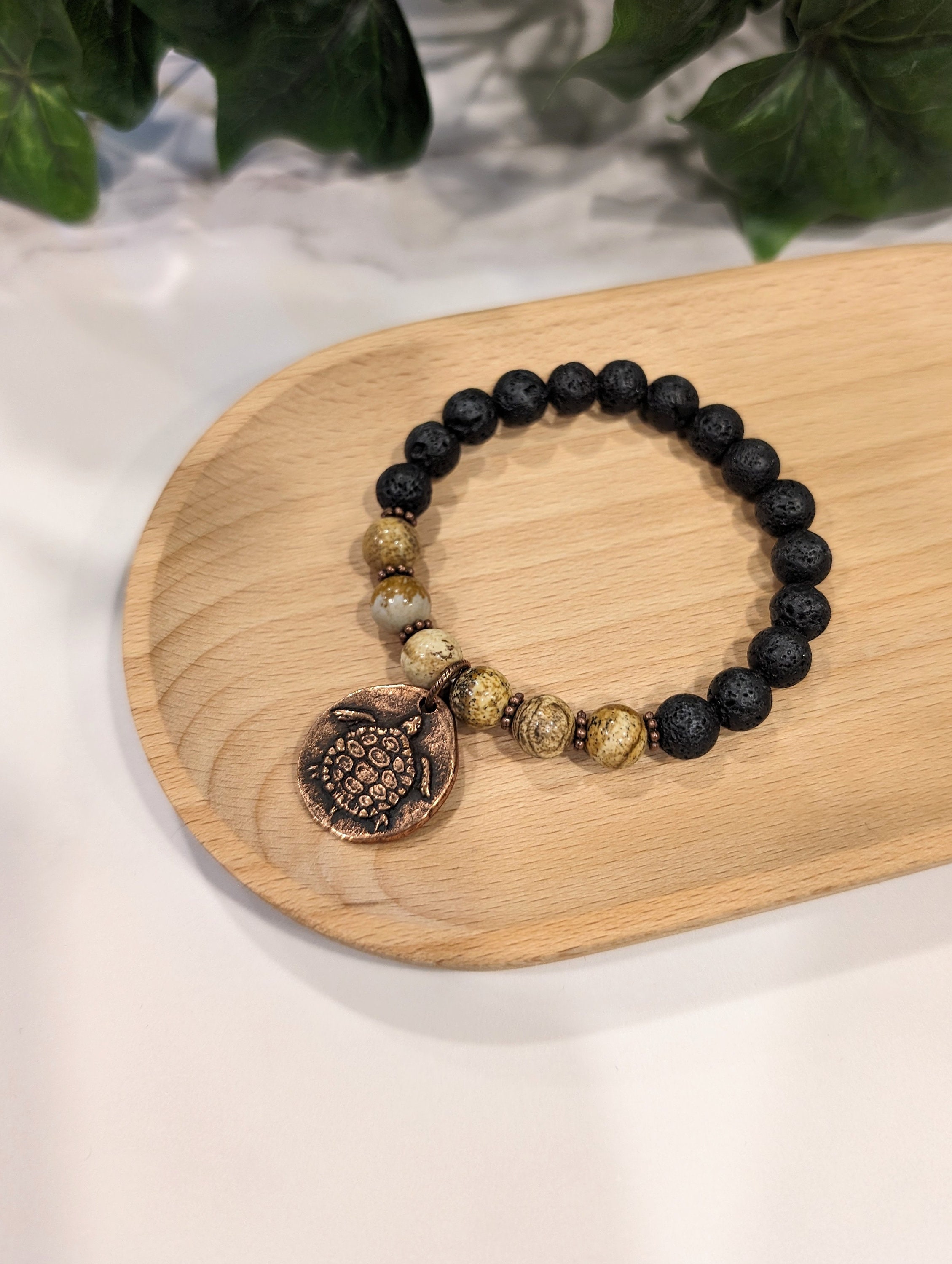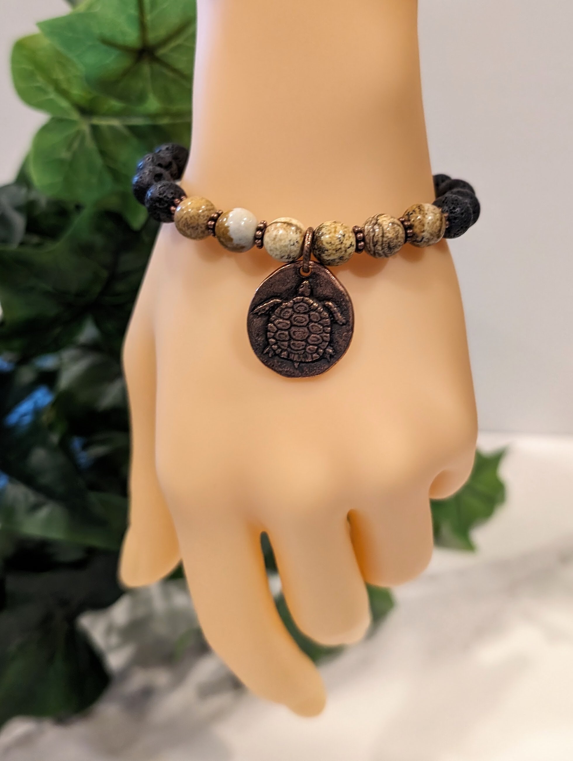 Beads & Charm: Polished 8 mm picture jasper (unique landscape patterns) strung on durable elastic fiber with a solid copper turtle charm.