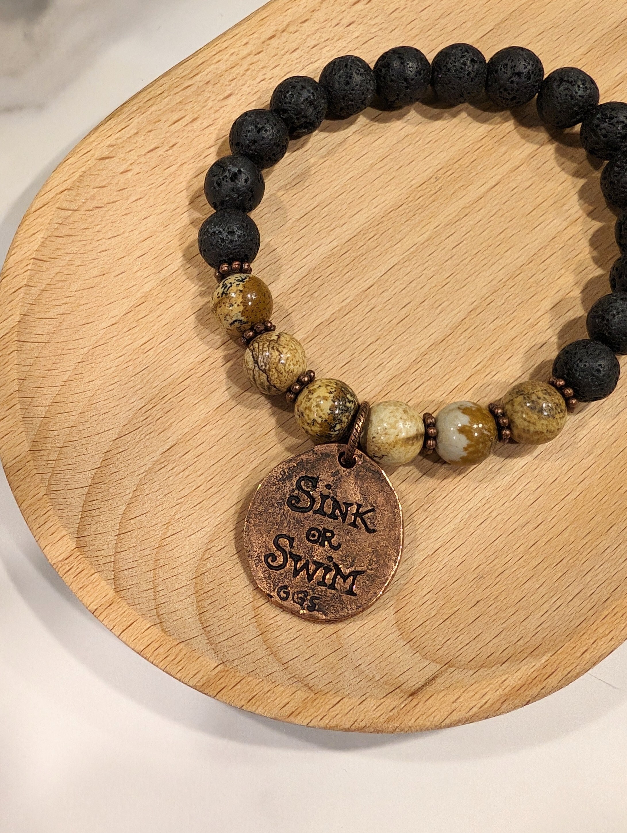 This Picture Jasper Copper Turtle Bracelet features scenic picture jasper beads paired with a copper turtle charm with the message, "Sink of Swim" carved into the back. Crafted to remind you of stability, patience and timeless strength.