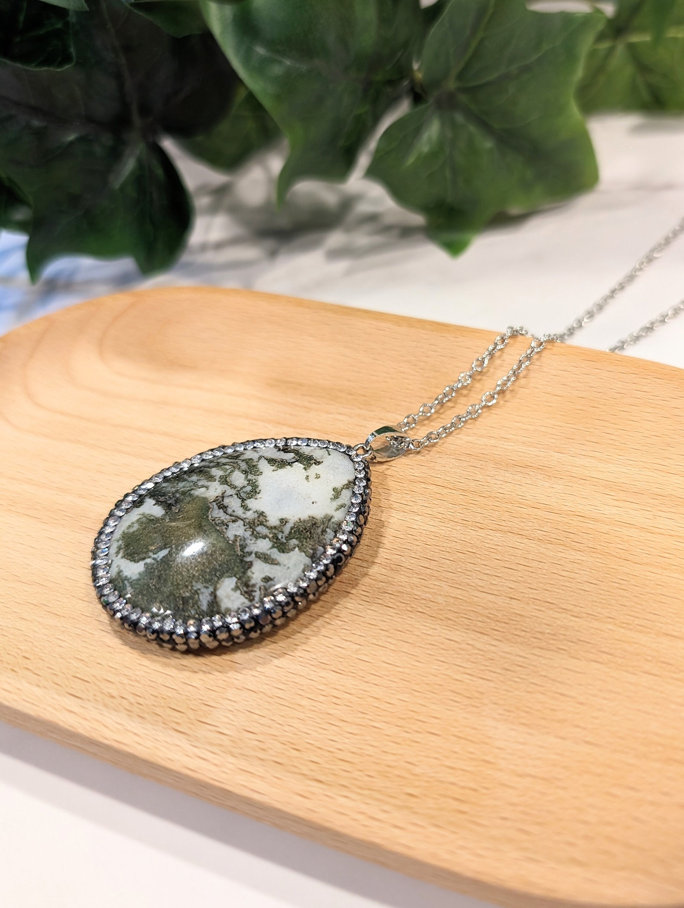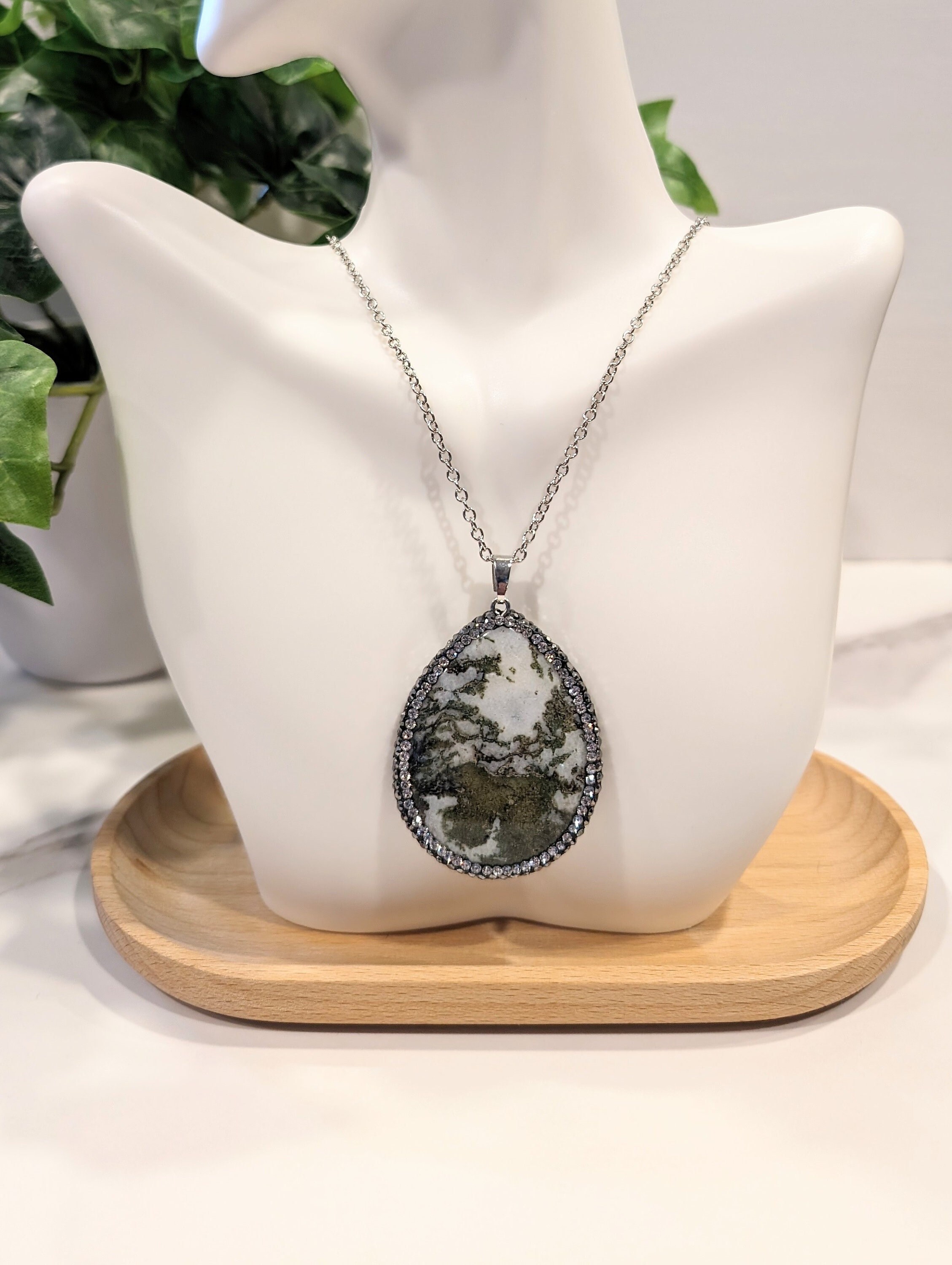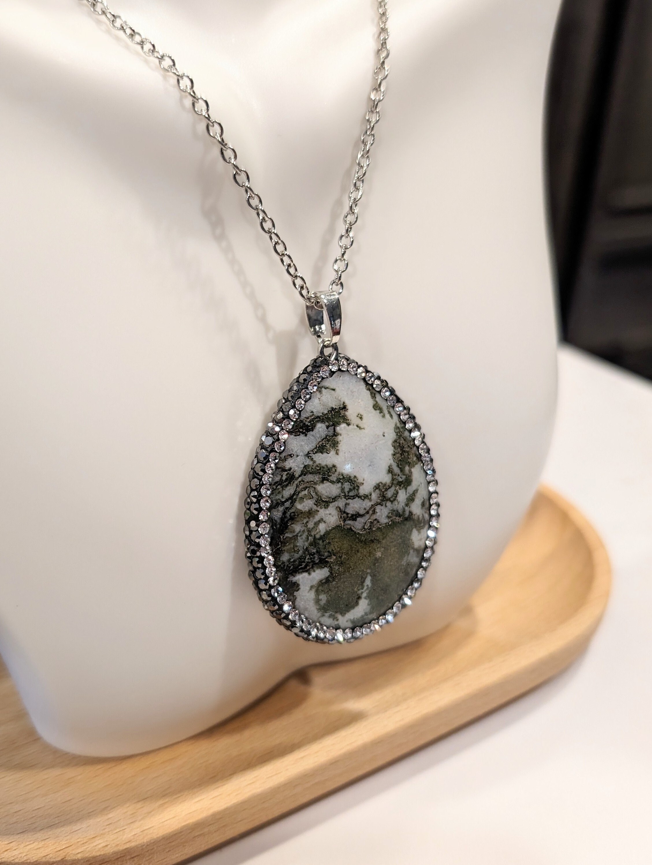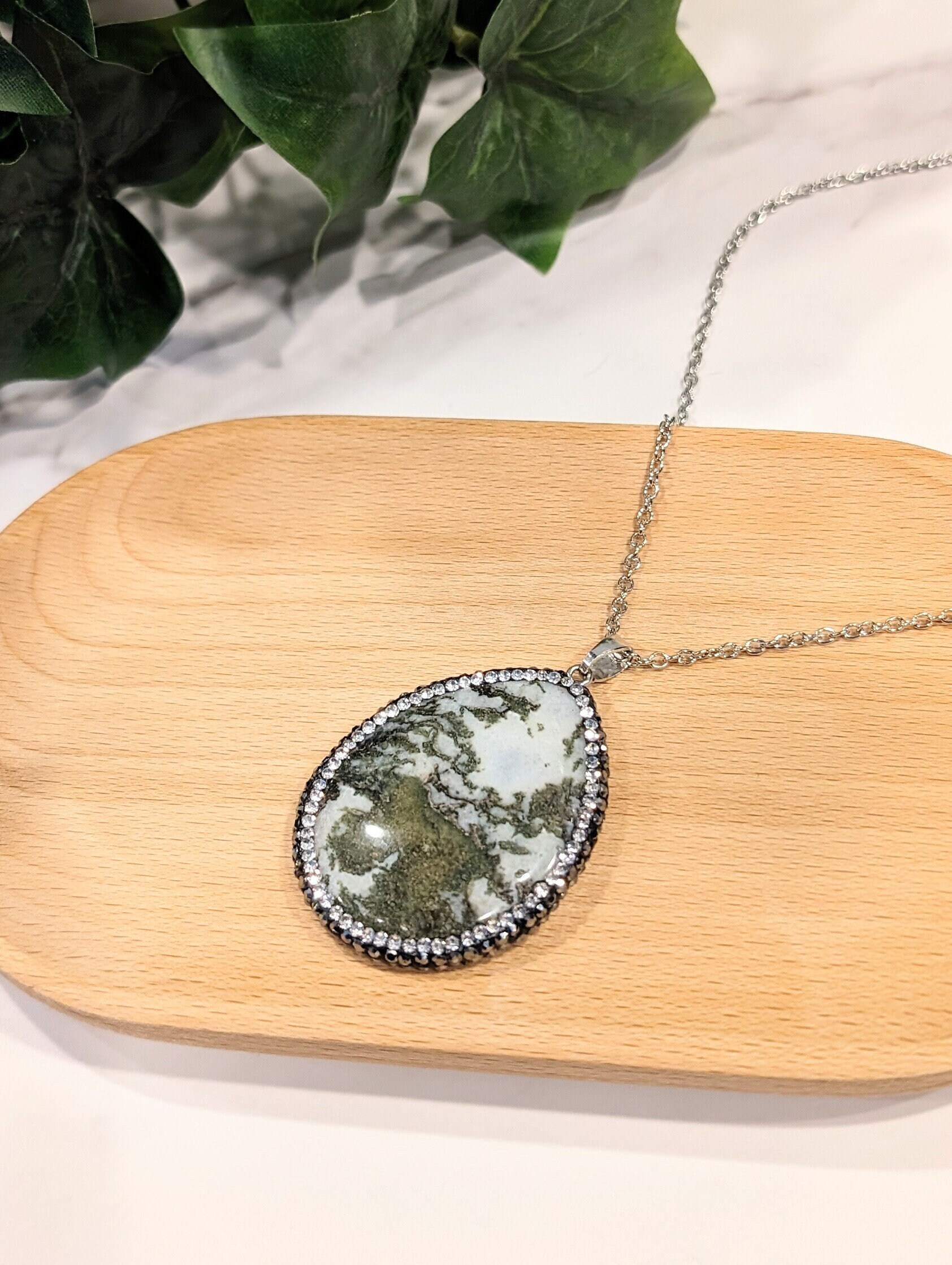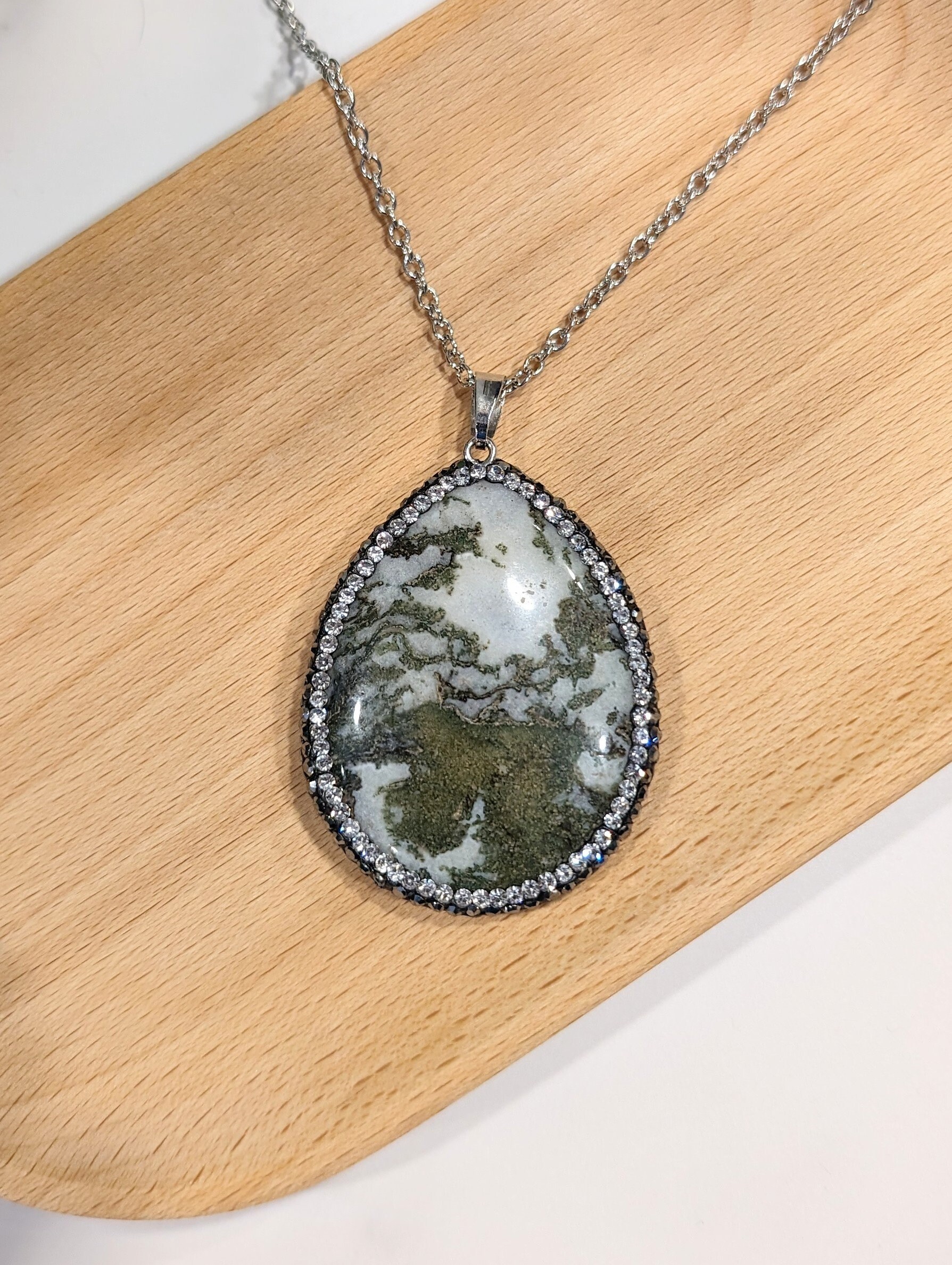 Pendant: Oval green tree agate (1–1.5 inches, dendritic patterns) + clear rhinestone accents