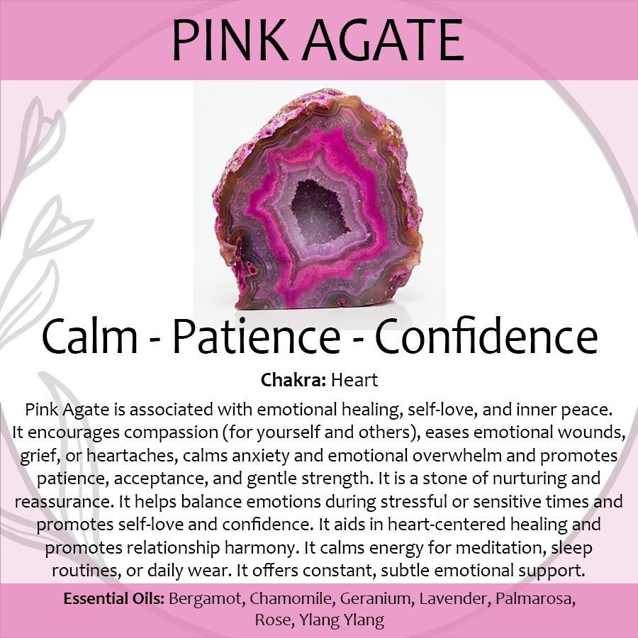 Love & Balance: Pink agate is celebrated for soothing heartbreak and opening the heart chakra, while encouraging forgiveness and gentle emotional stability.