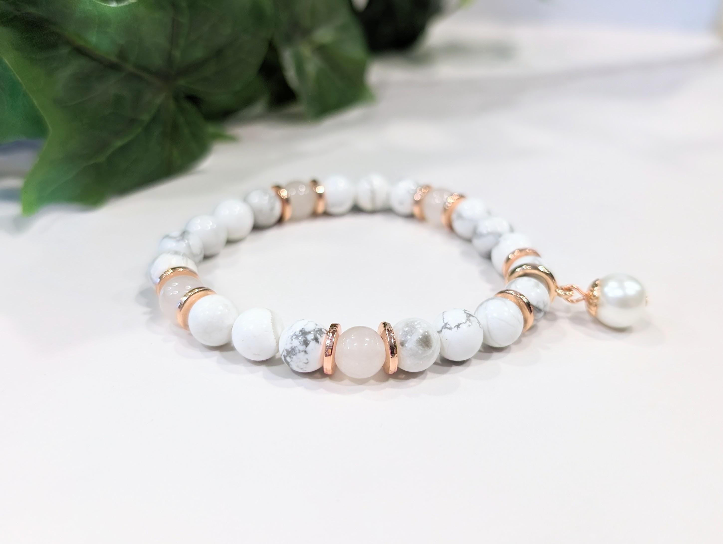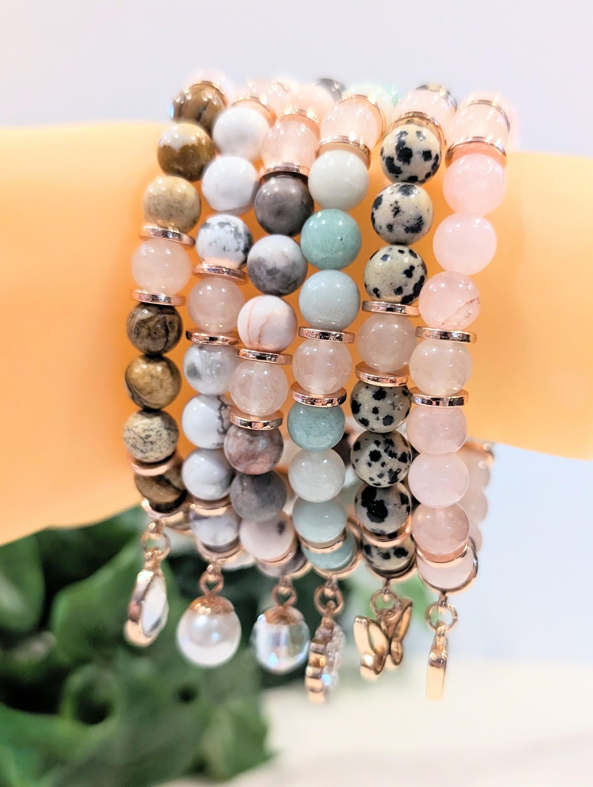 Choose between Rose Quartz (love & healing), Amazonite (peace & communication), Howlite (calm & patience), Dalmatian Jasper (joy & balance), Pink Zebra Jasper (creativity & strength), and Picture Jasper (grounding & inspiration).