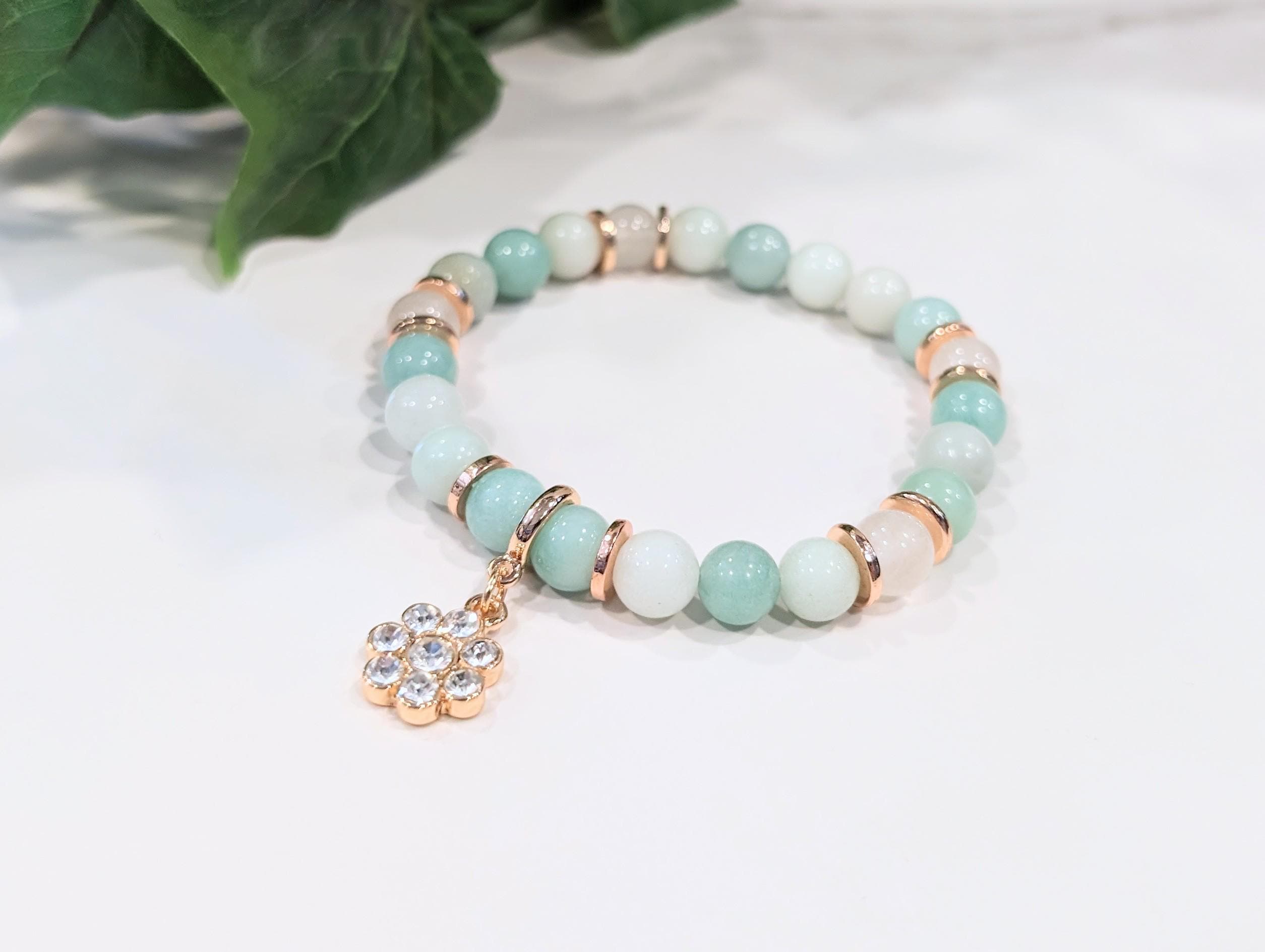 Embrace tranquility and elegance with this Handmade Gemstone Charm Bracelet in Rose Gold. This bracelet features a harmonious blend of natural gemstones, each chosen for their unique properties and beauty.