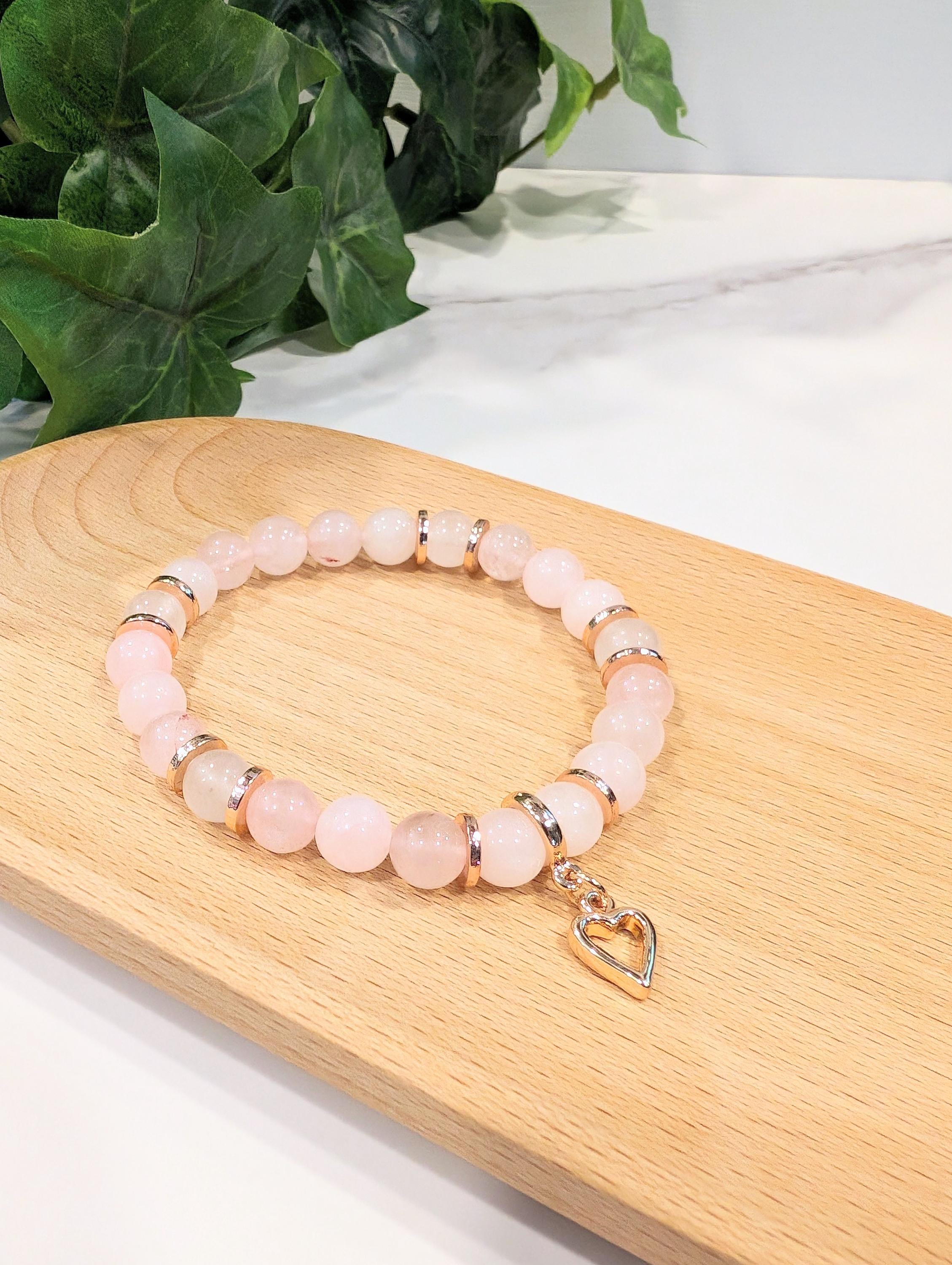 Beads & Charm: Polished 8 mm genuine rose quartz beads are strung alongside rose‑gold accent beads and one meaningful charm.