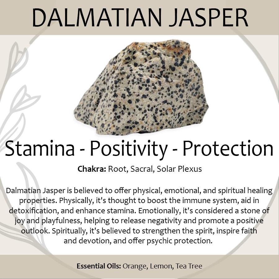 Arrives in a gift box + organza pouch, with a card detailing Dalmatian Jasper properties and charm meanings.