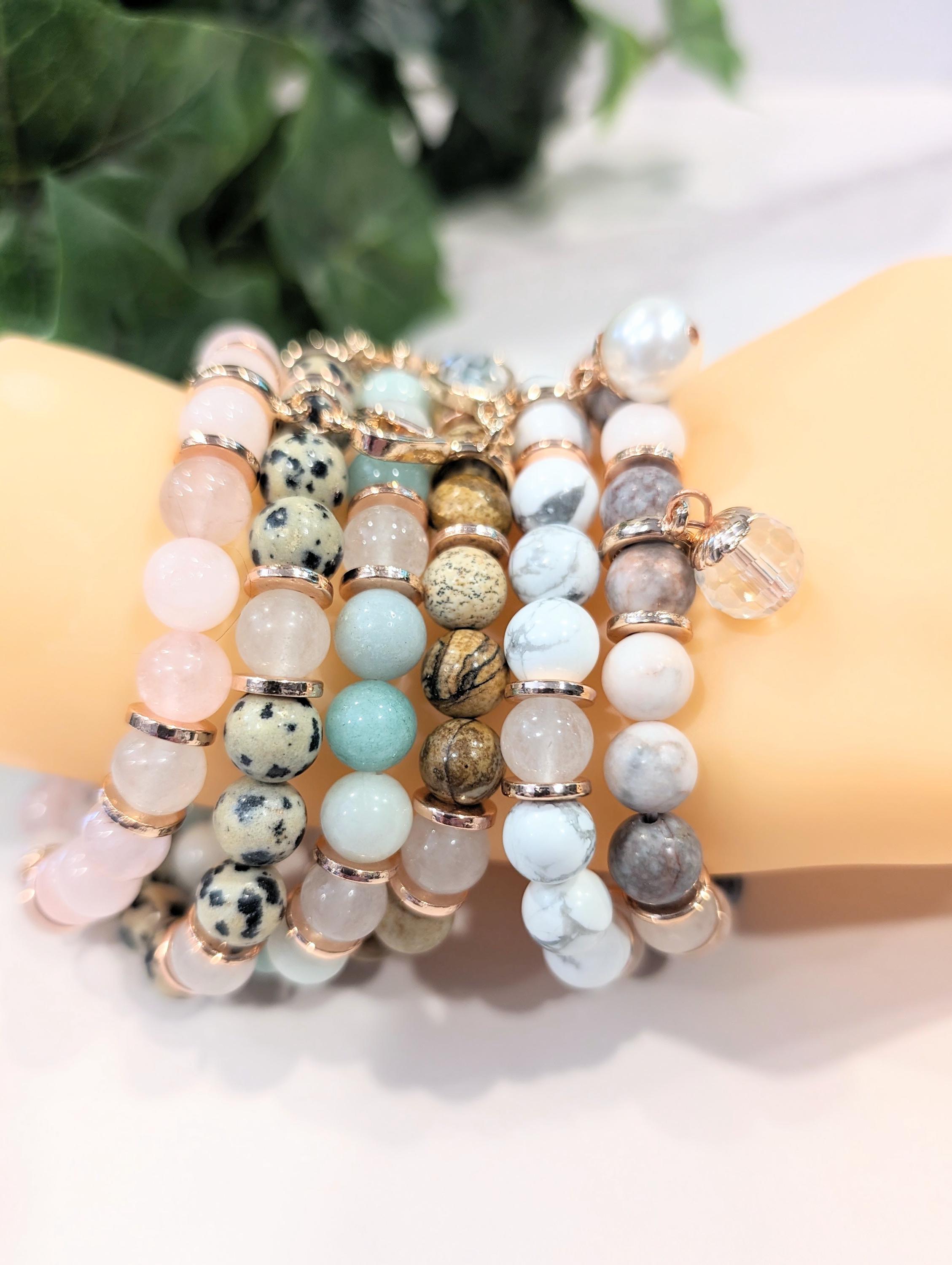 Polished 8 mm Dalmatian Jasper beads strung on durable elastic fiber, interspersed with rose gold spacers and the charm of your choice.