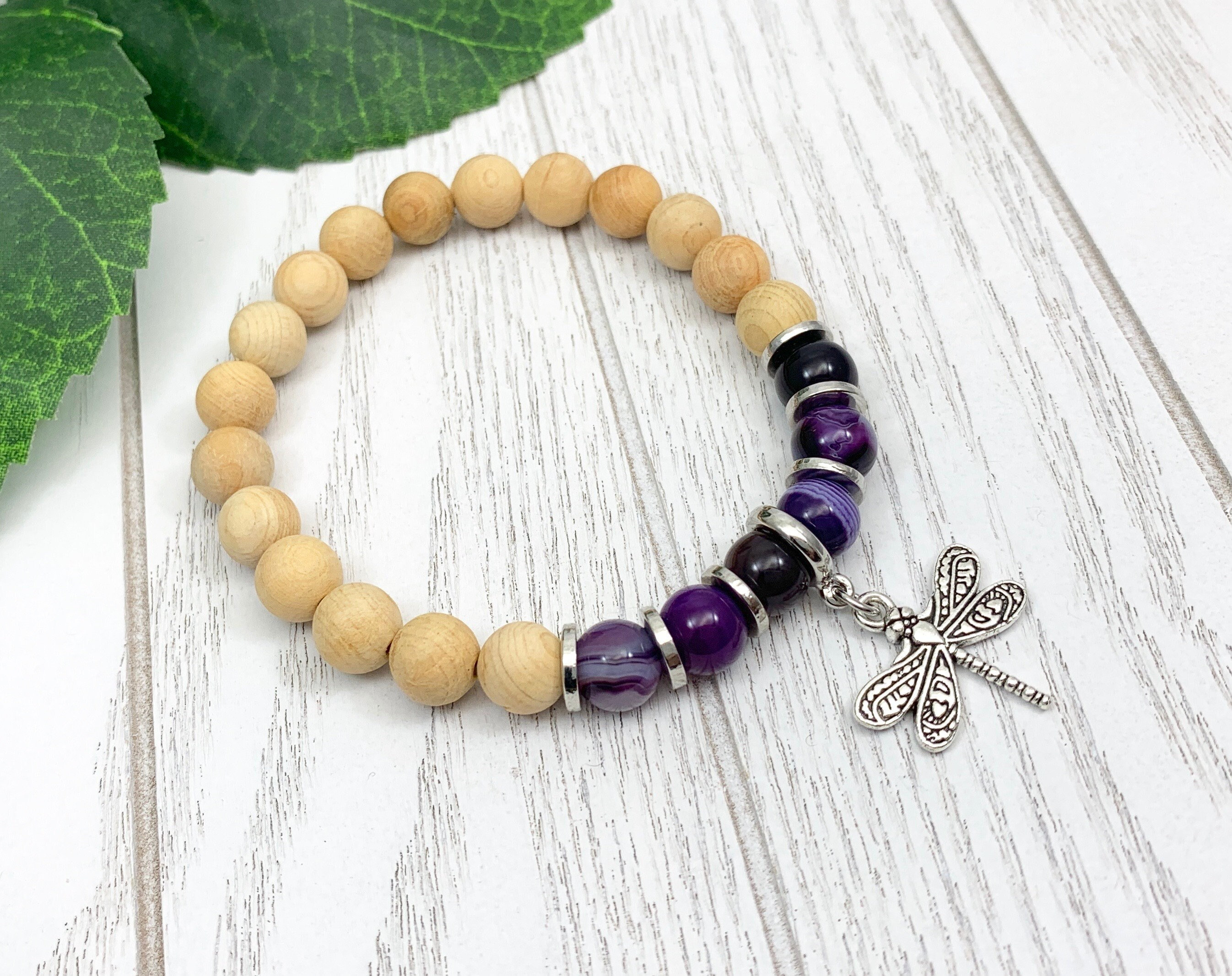 Beads & Charm: Polished 8 mm purple agate beads strung on durable elastic fiber, with a silver-plated dragonfly charm.