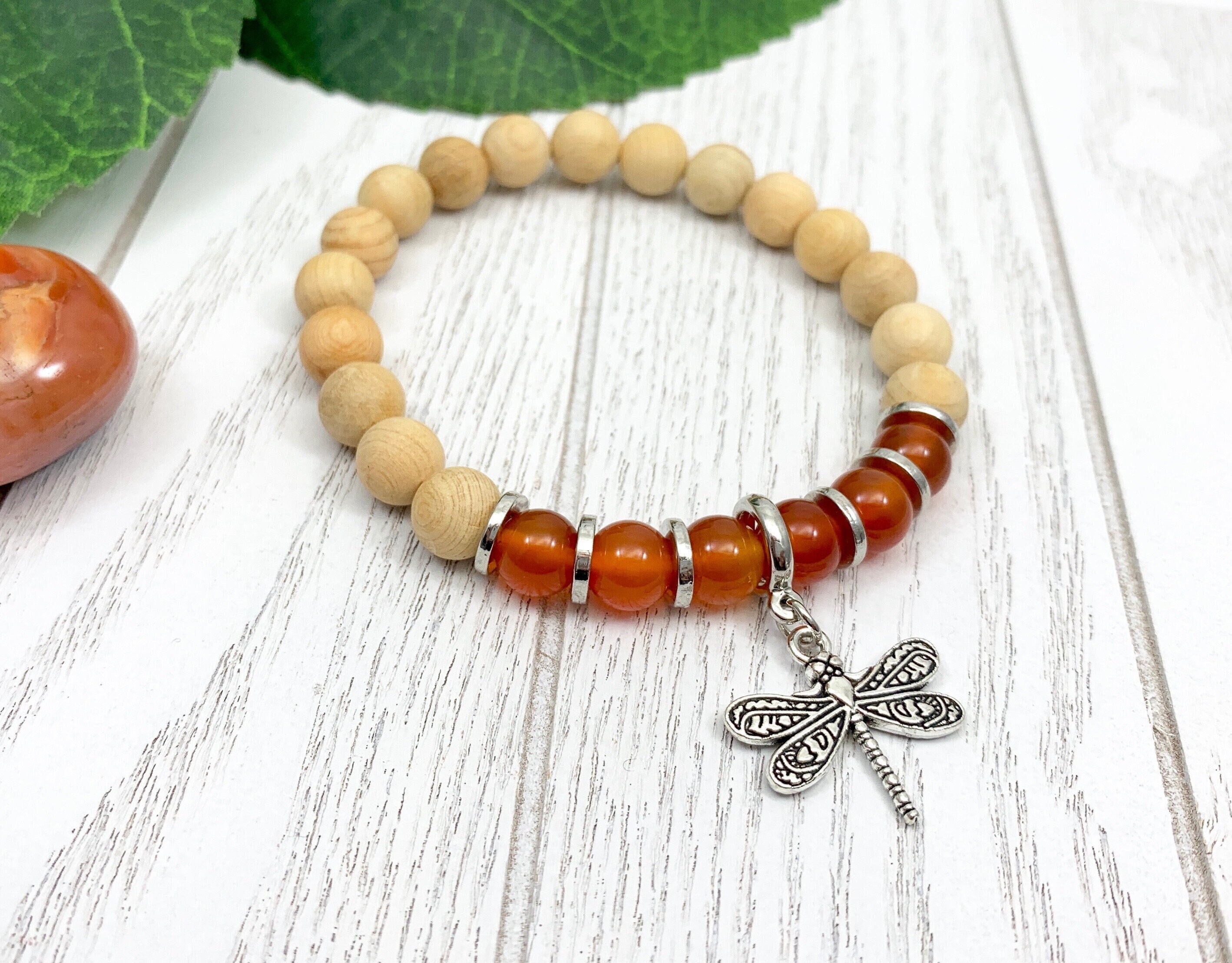 Beads & Charm: Polished 8 mm carnelian beads strung on durable elastic fiber, with a silver-plated dragonfly charm.