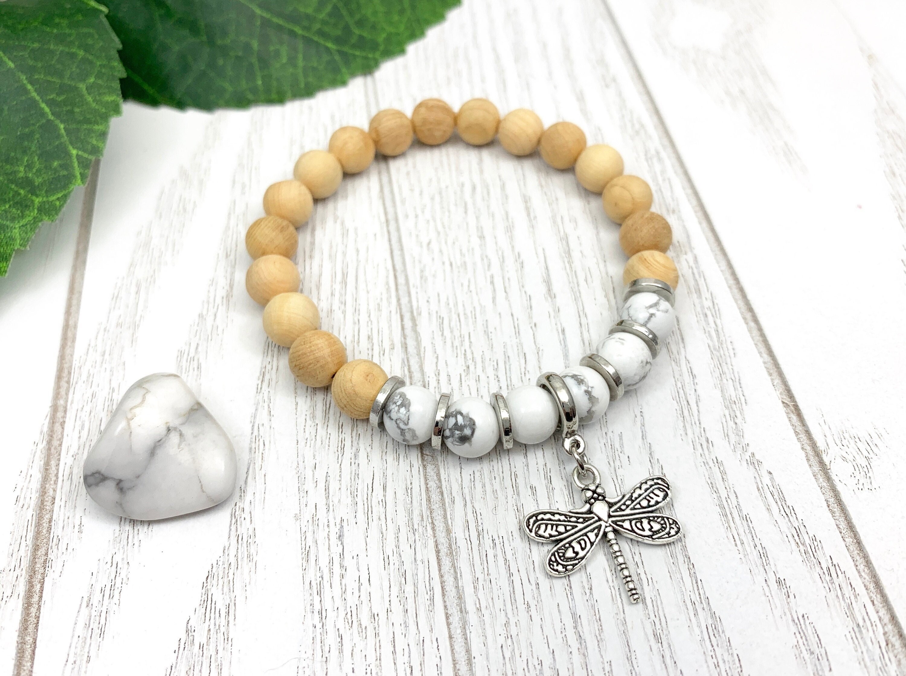 Beads & Charm: Polished 8 mm howlite beads strung on durable elastic fiber, with a silver-plated dragonfly charm.