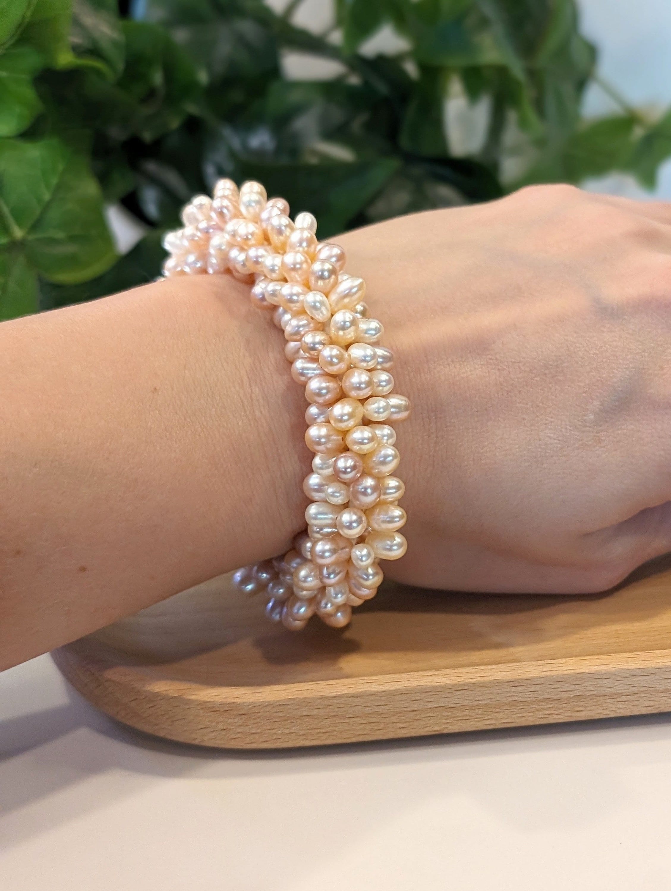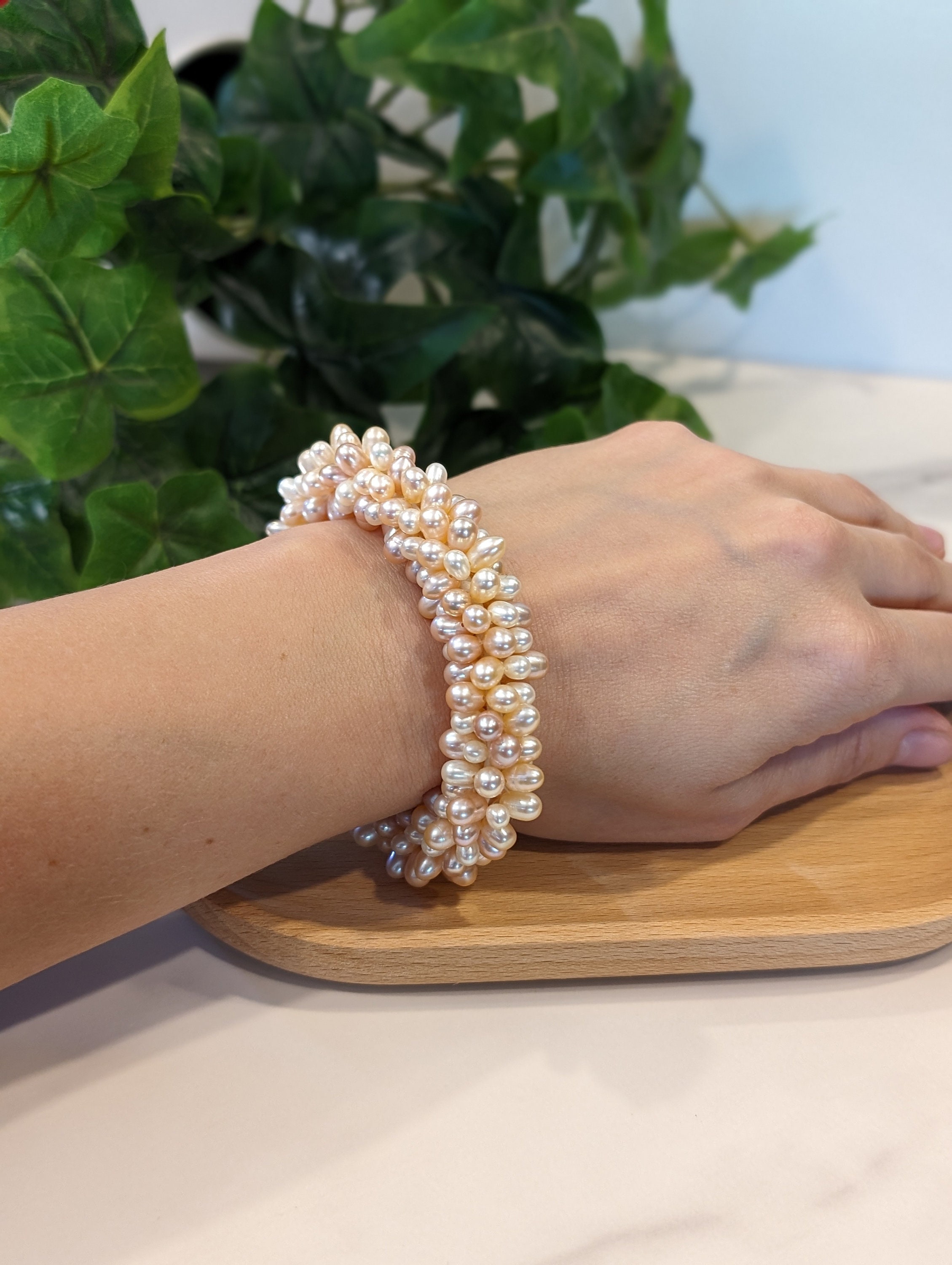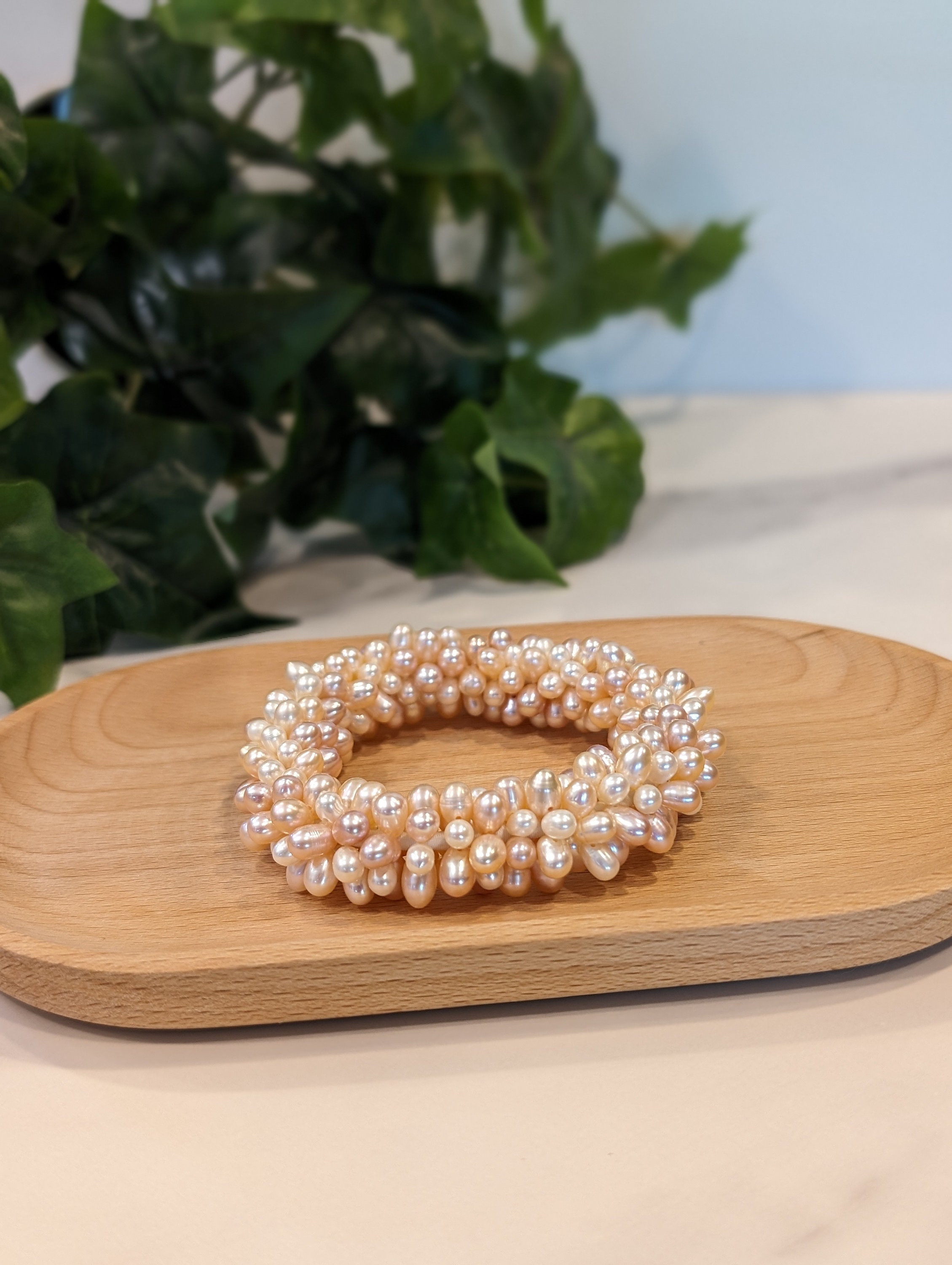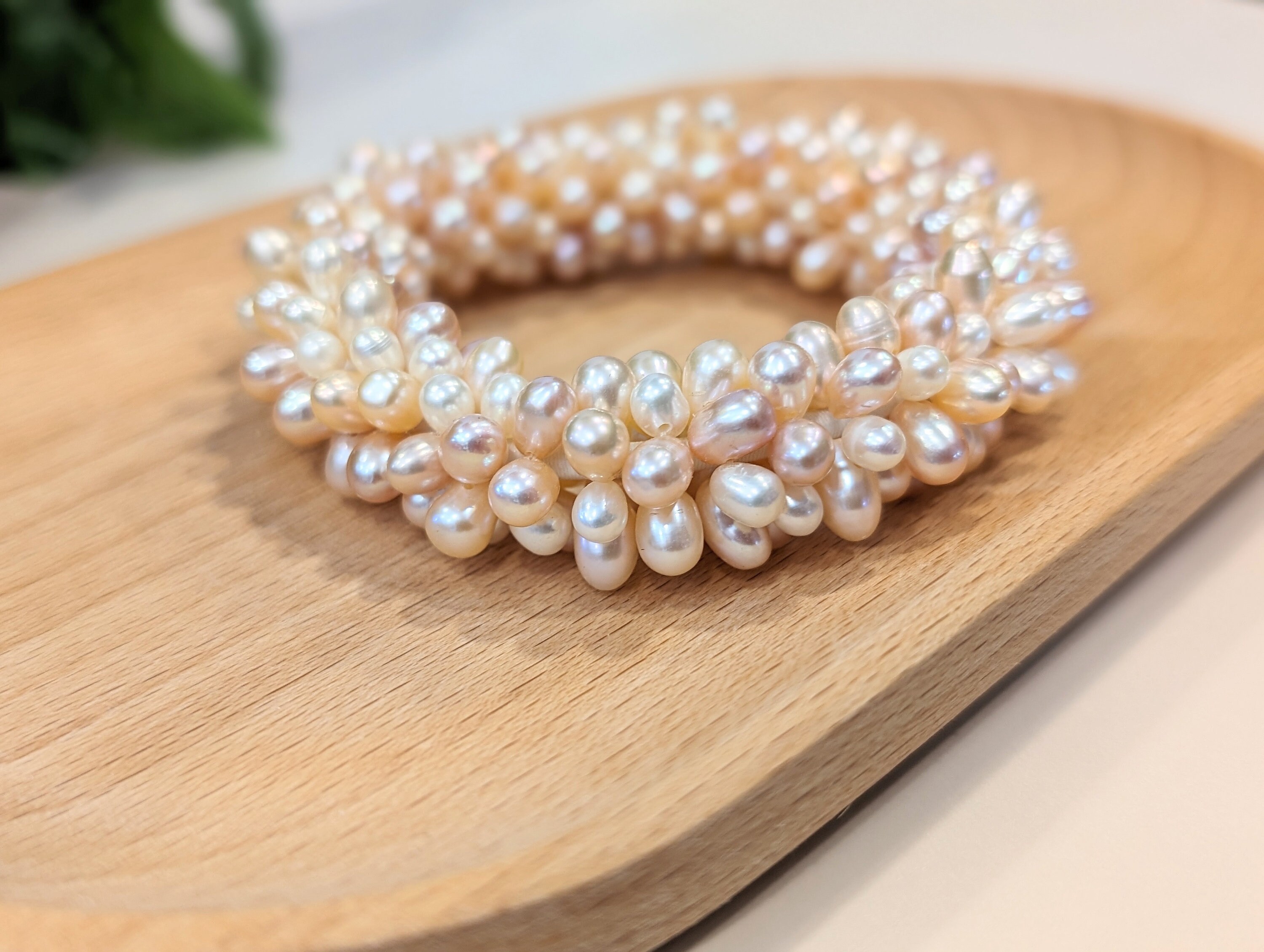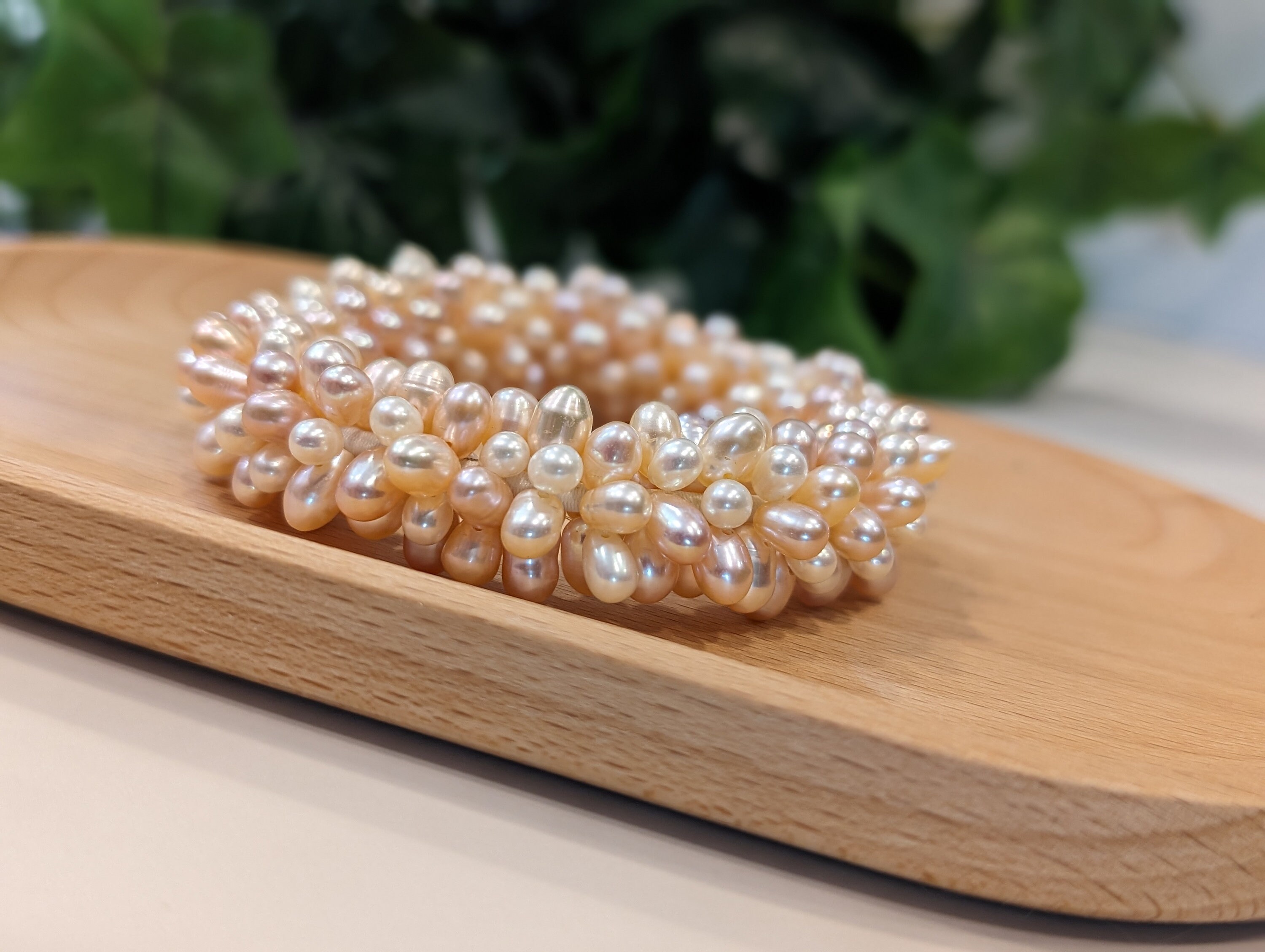 Beads & Clasp: Uniform faux pearls (4-6 mm) strung on original elastic thread.