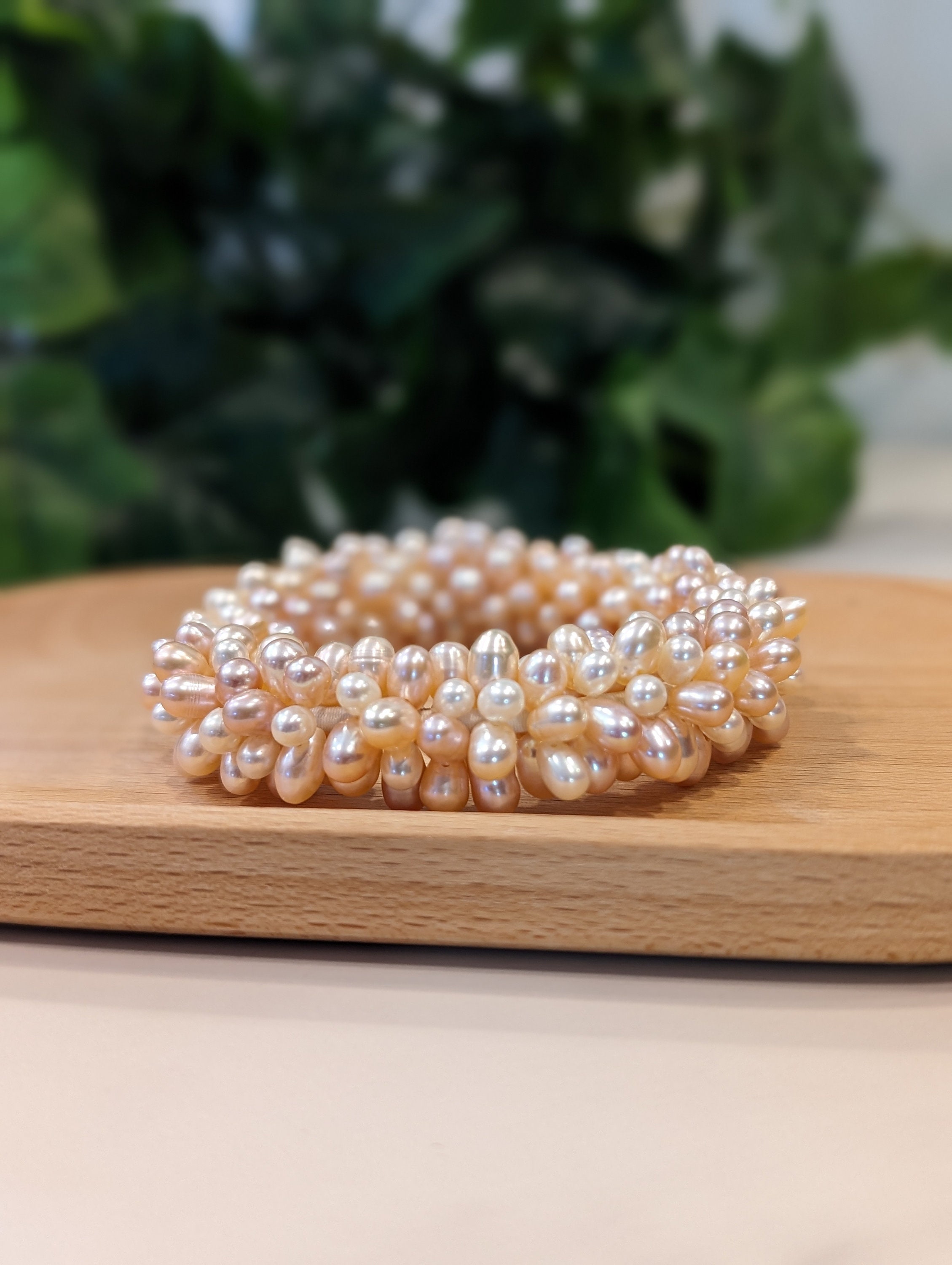 This Vintage Light Pearl Beaded Bracelet features delicate faux pearls in a serene pale champaign hue. Sourced to evoke timeless femininity and retro sophistication.