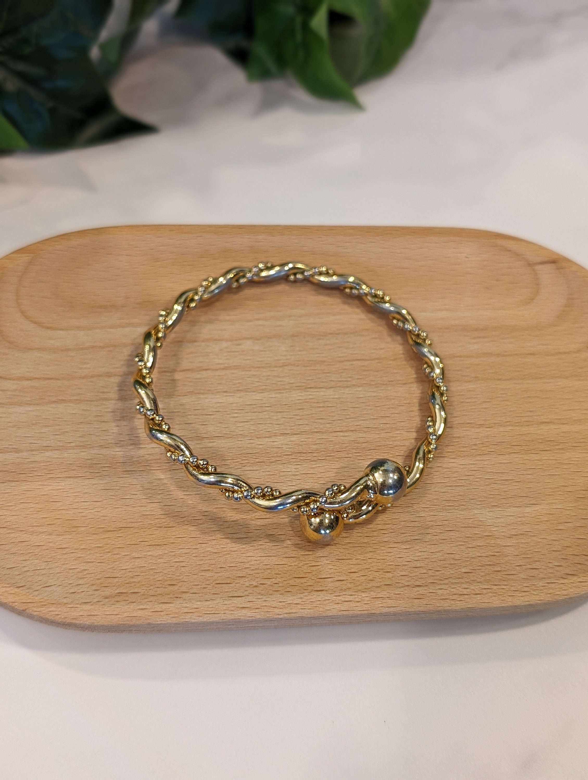 This Vintage Gold Twist Swirl Bangle Cuff features a sculptural twisted design in polished gold-tone metal. Sourced to evoke formal sophistication and retro charm.