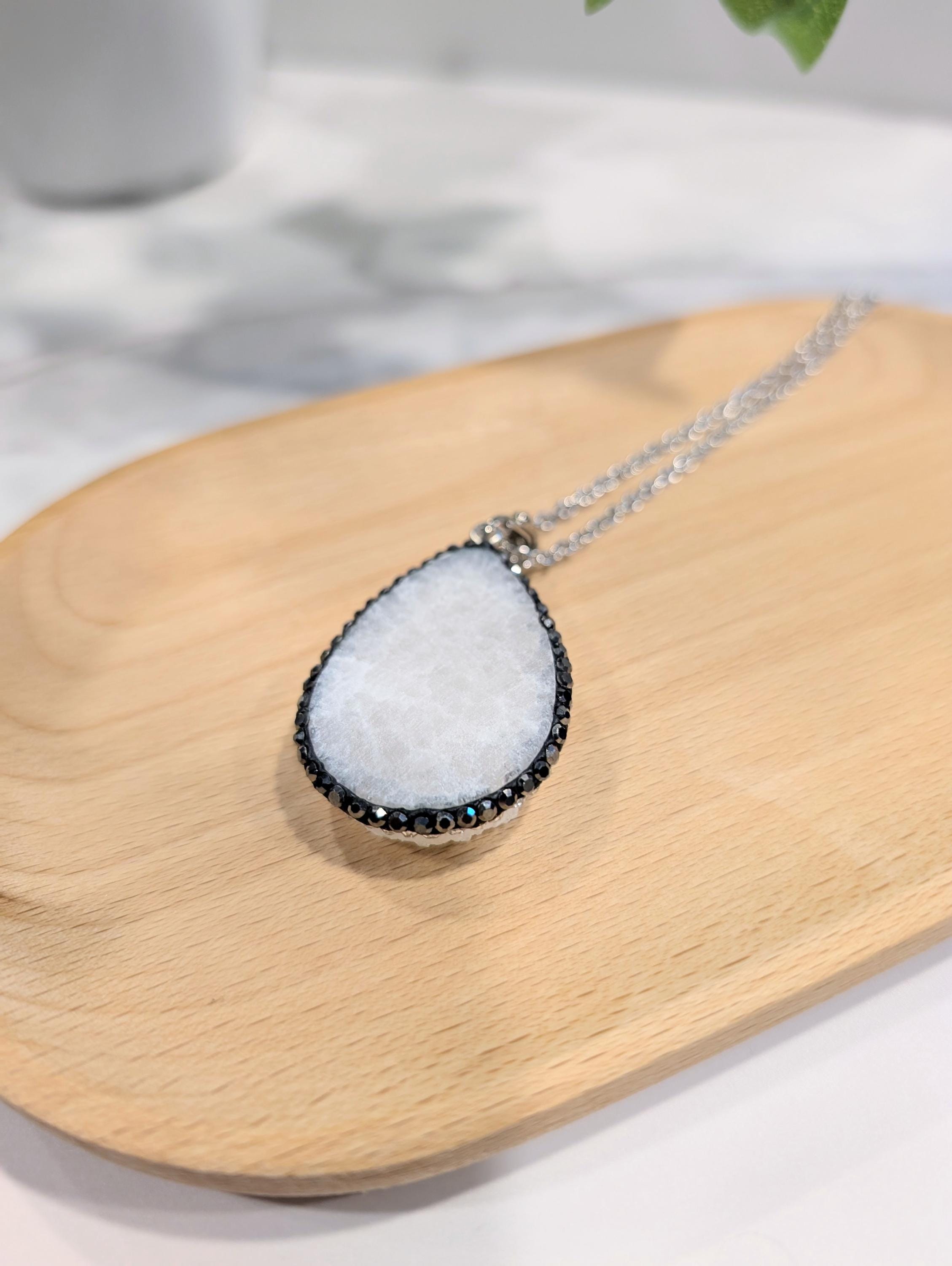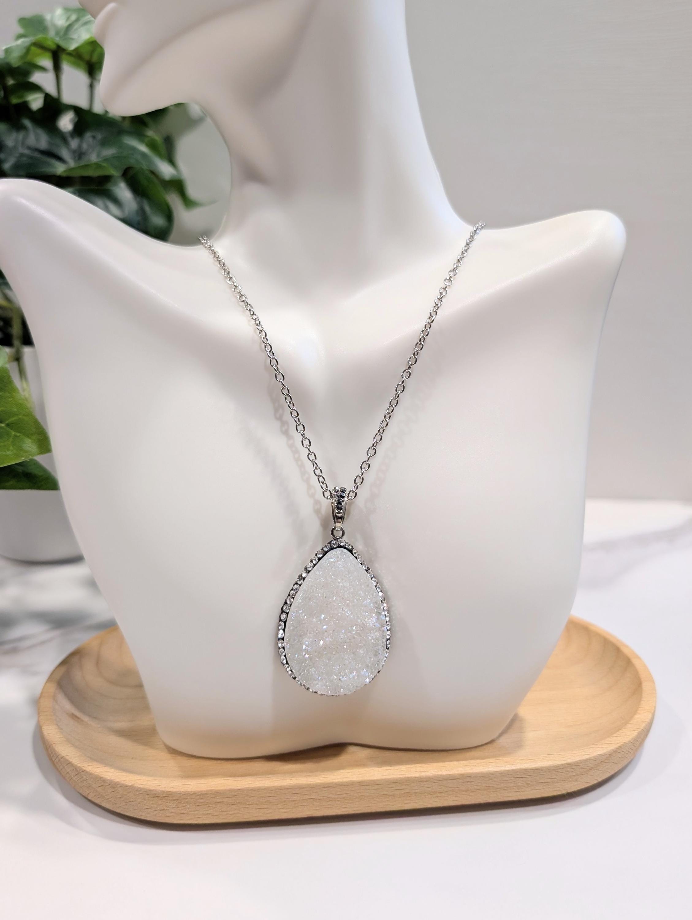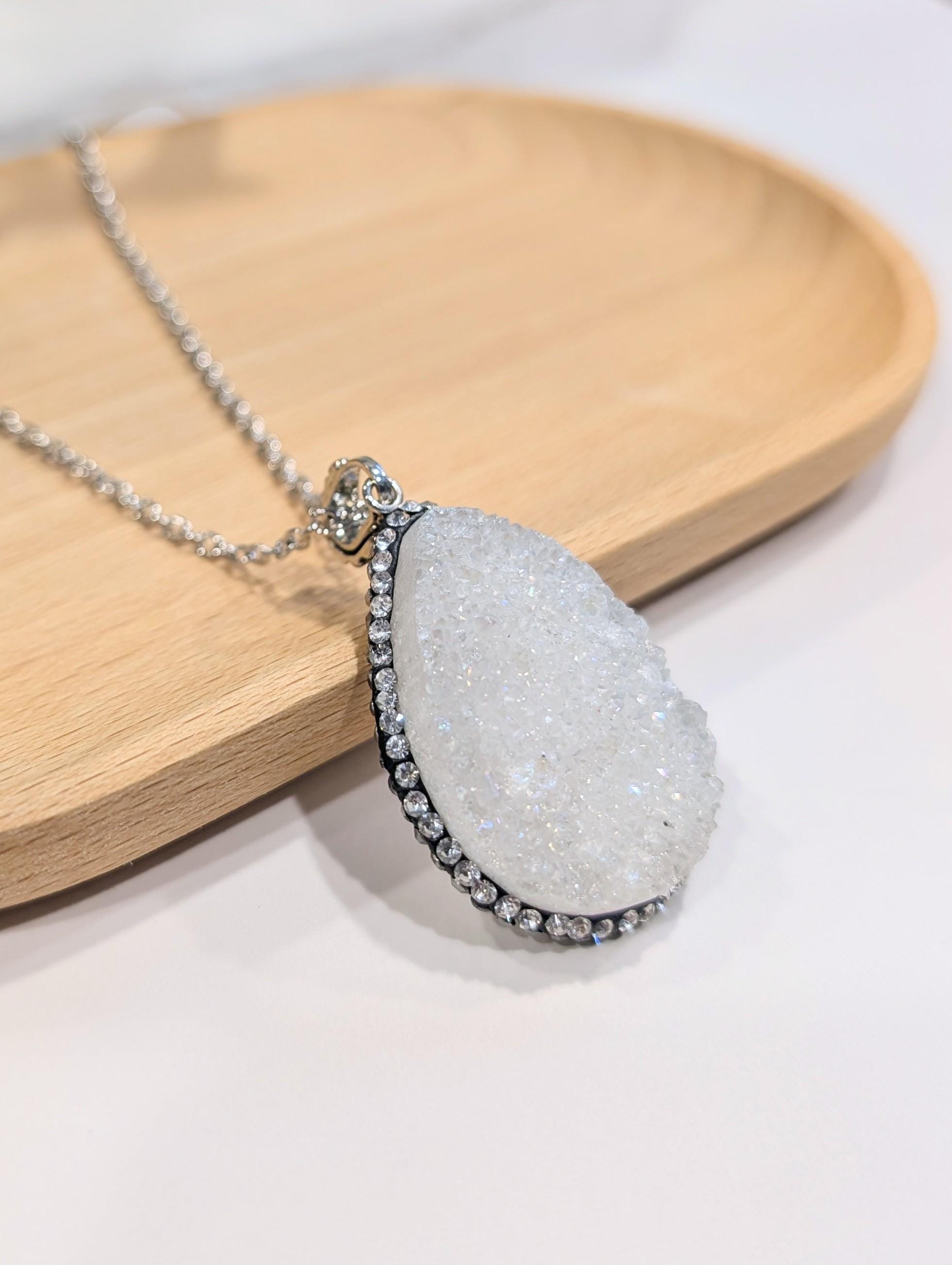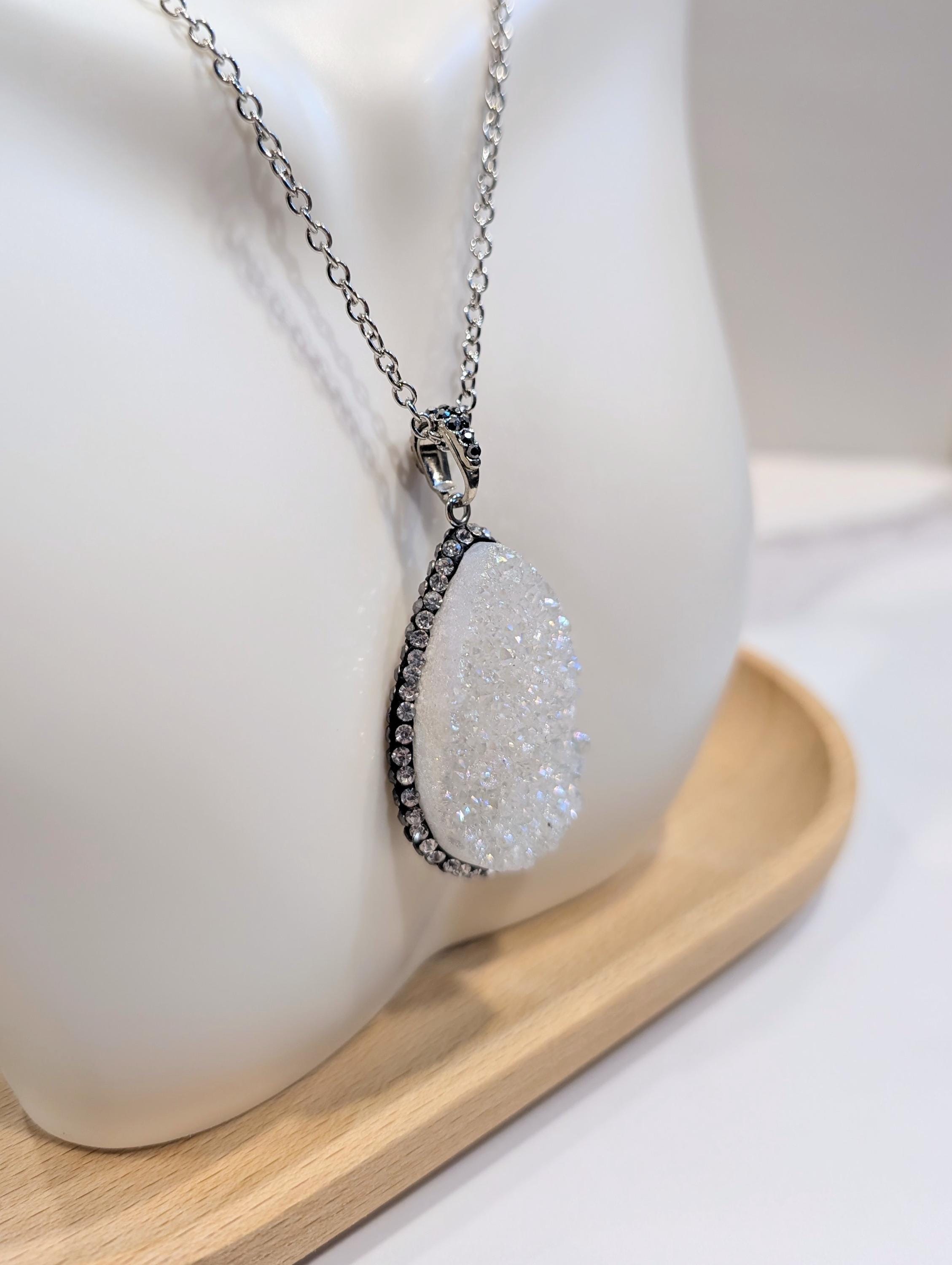 1.5-inch natural quartz druzy teardrop with rhinestone halo on an 18-inch chain.