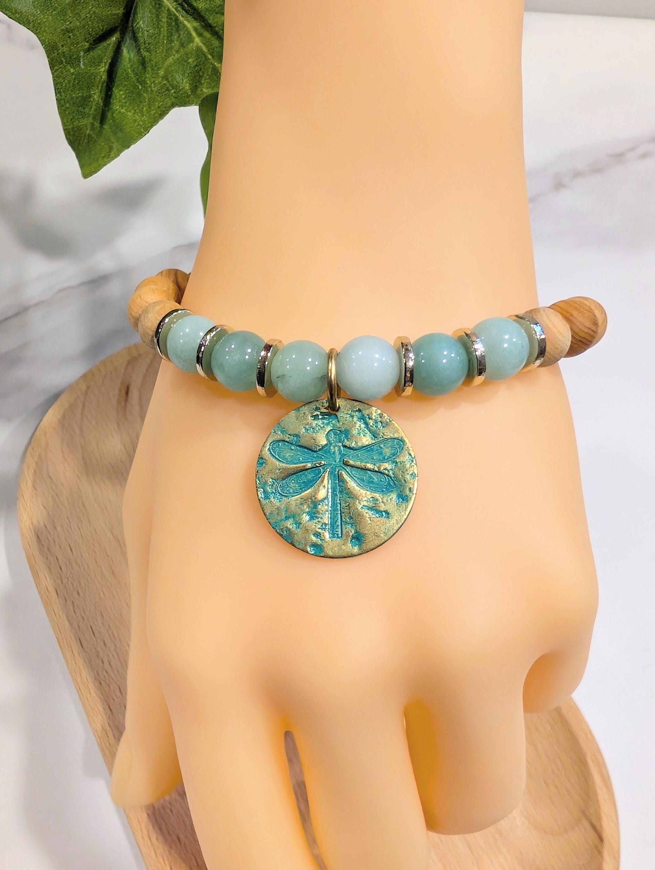 This Amazonite Dragonfly Charm Bracelet features soothing amazonite beads and a symbolic dragonfly charm. A wearable reminder of healing, growth, and renewal.