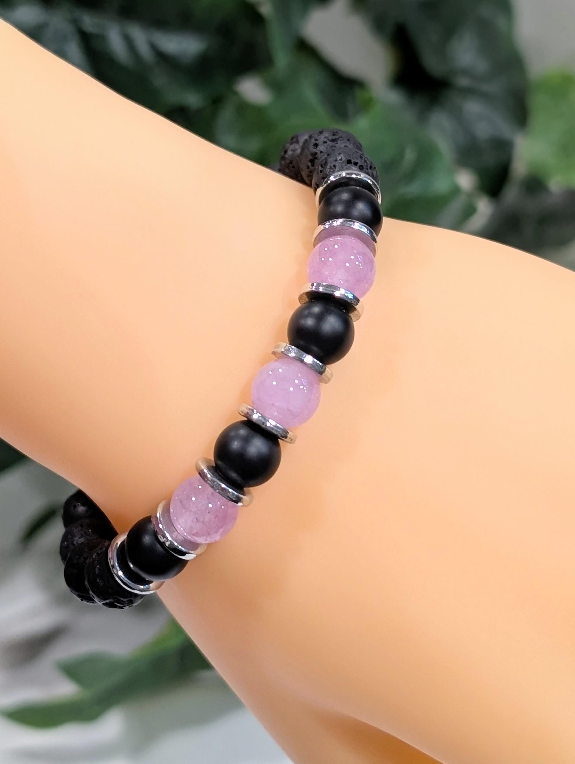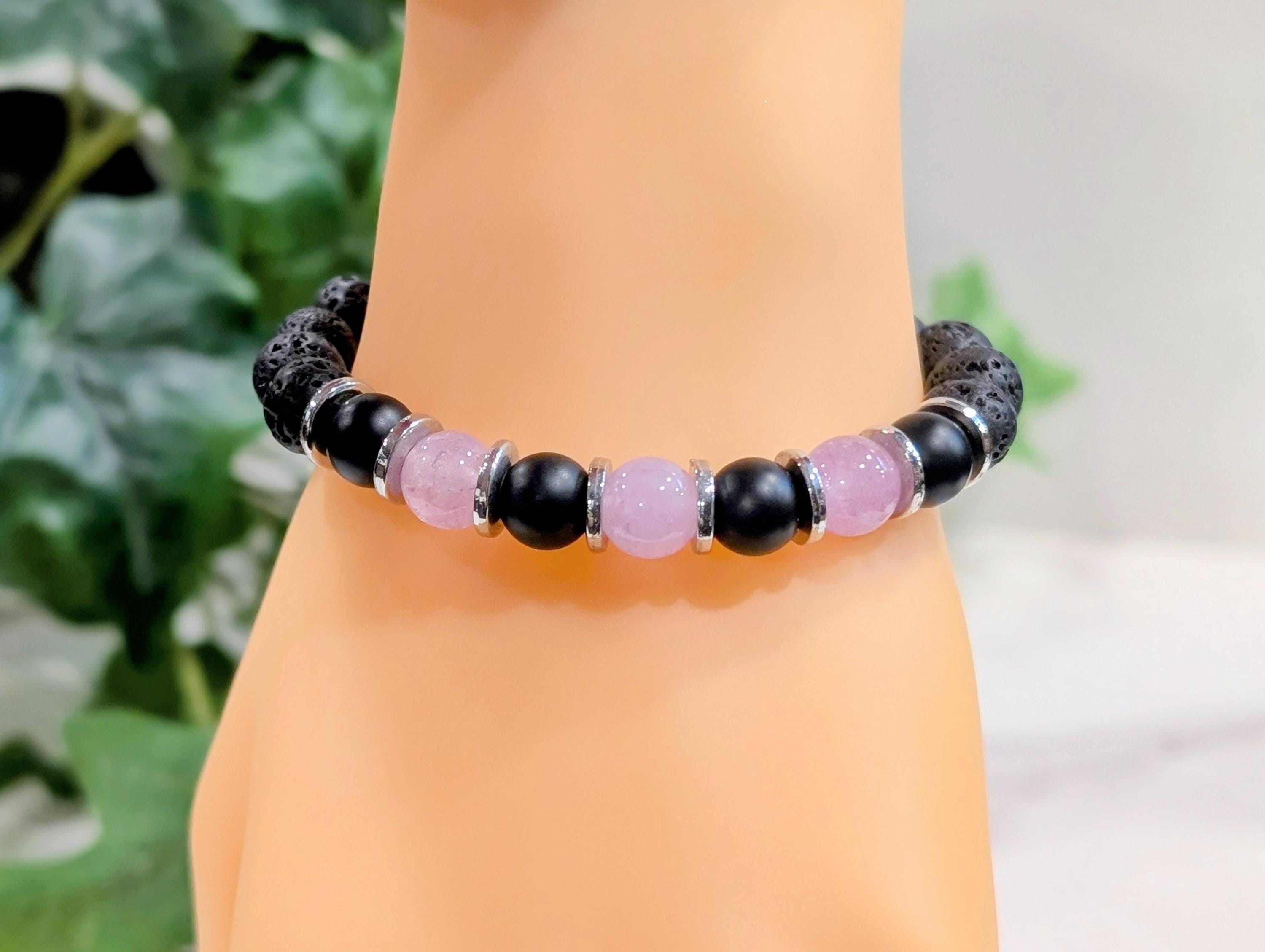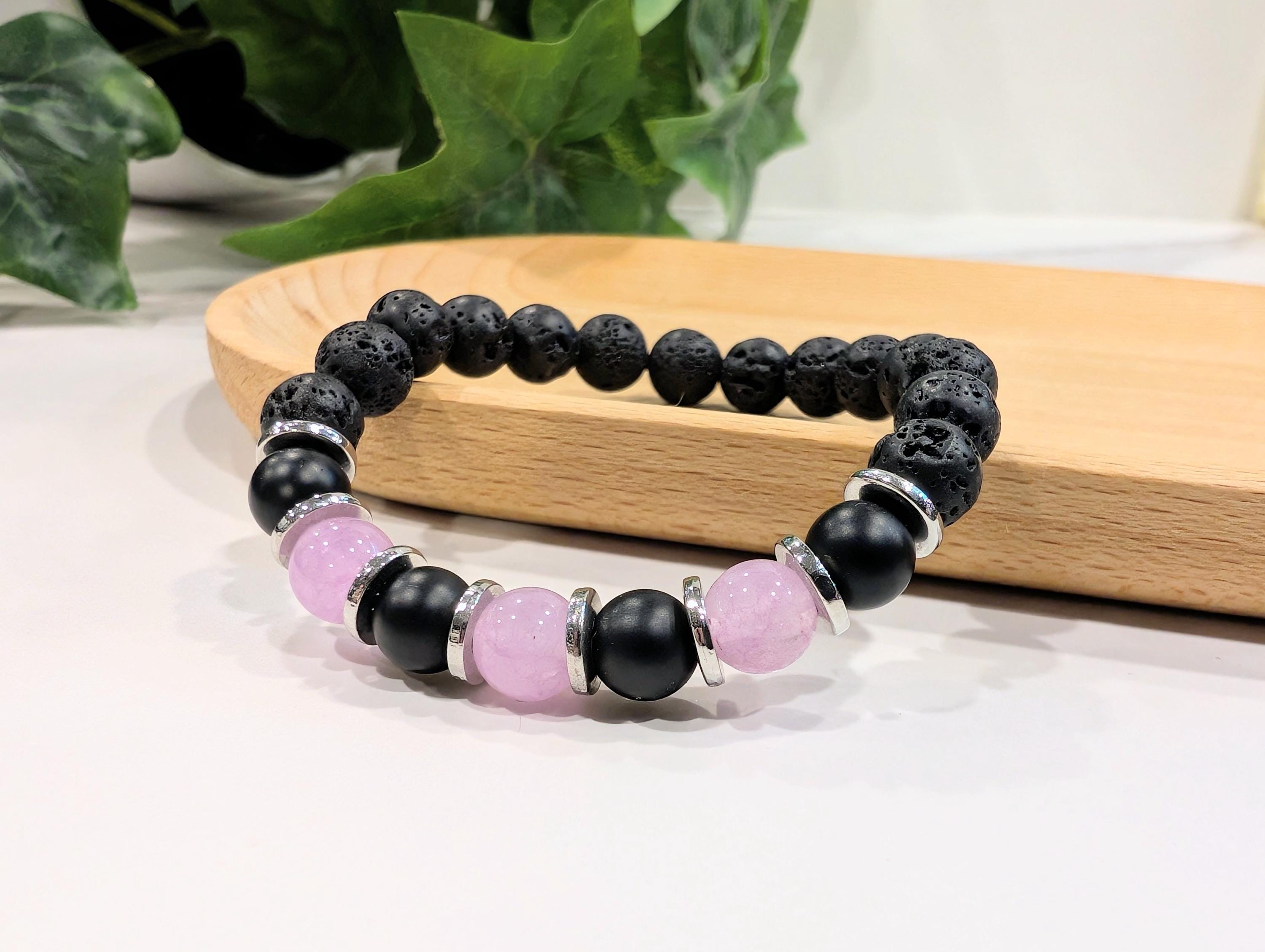 Beads: Matte black lava stones (porous diffuser) + black onyx + soft lavender-pink quartzite beads (3 accent stones for calming energy)