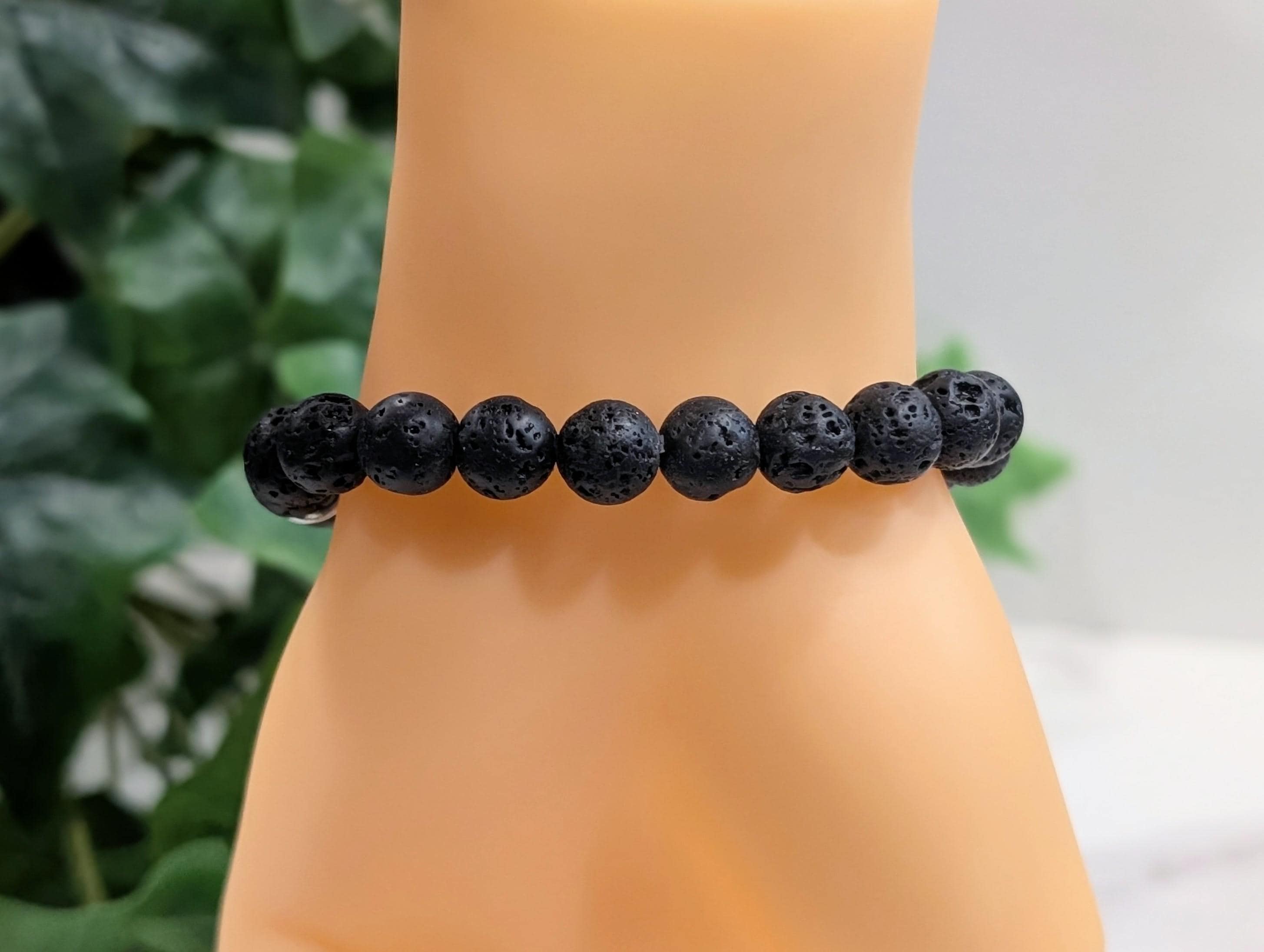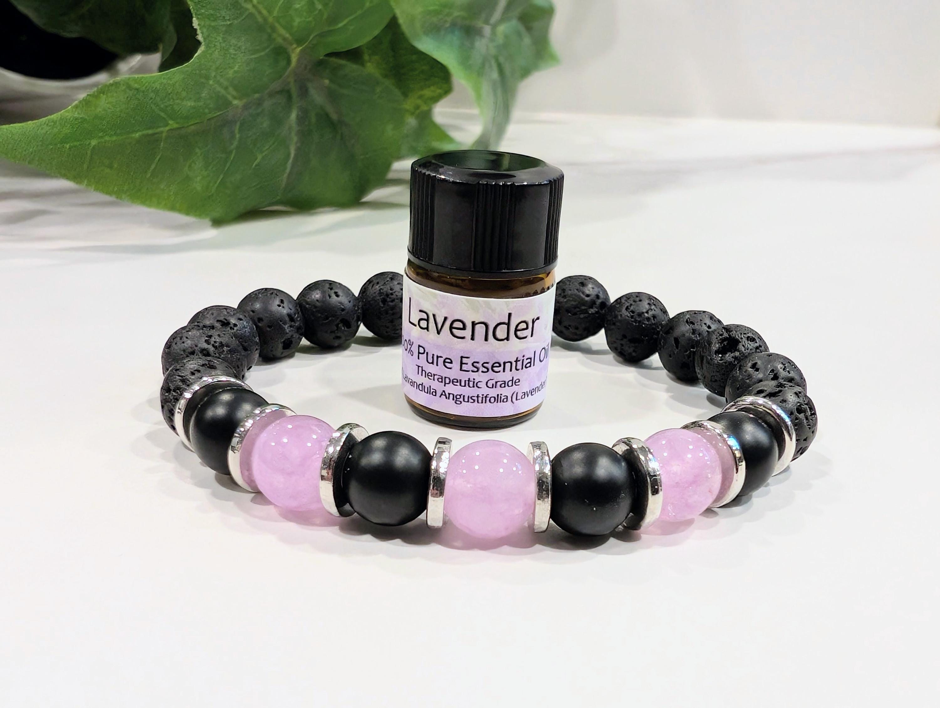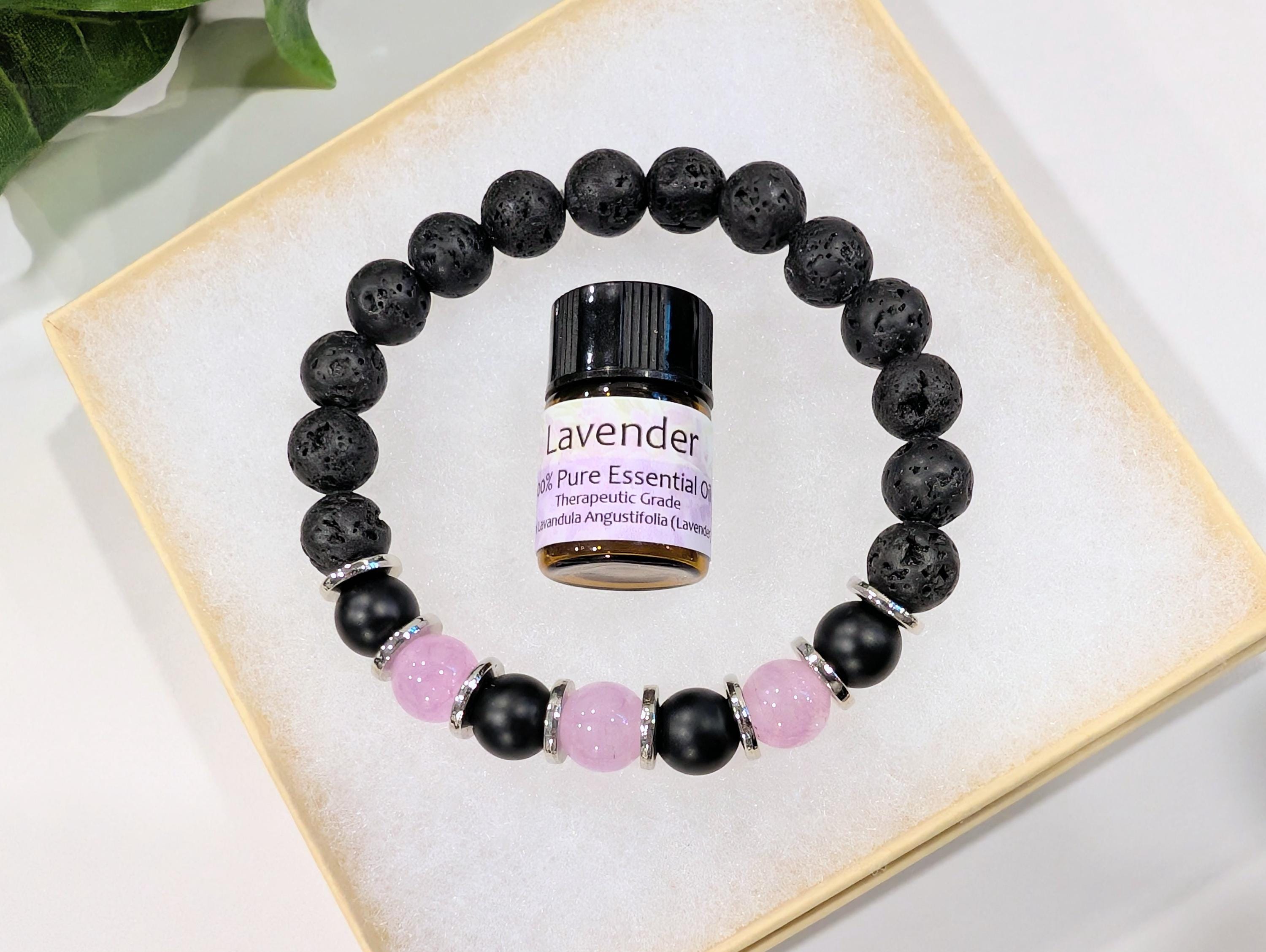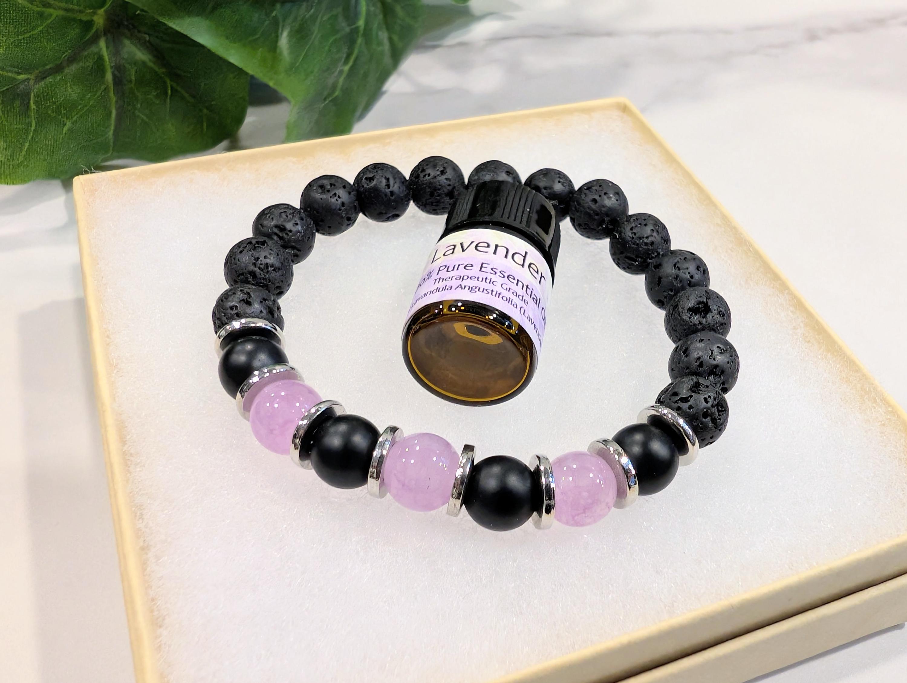 Beads: Matte black lava stones (porous diffuser) + black onyx + soft lavender-pink quartzite beads (3 accent stones for calming energy)