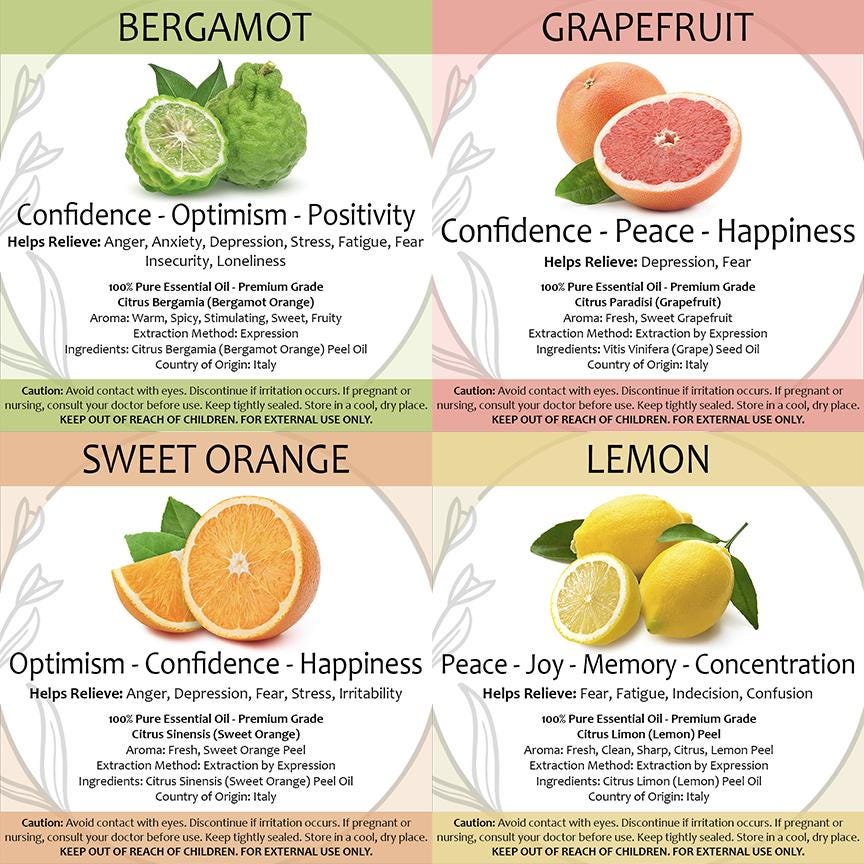 Includes all 4 citrus scents: Bergamot, grapefruit, sweet orange and lemon