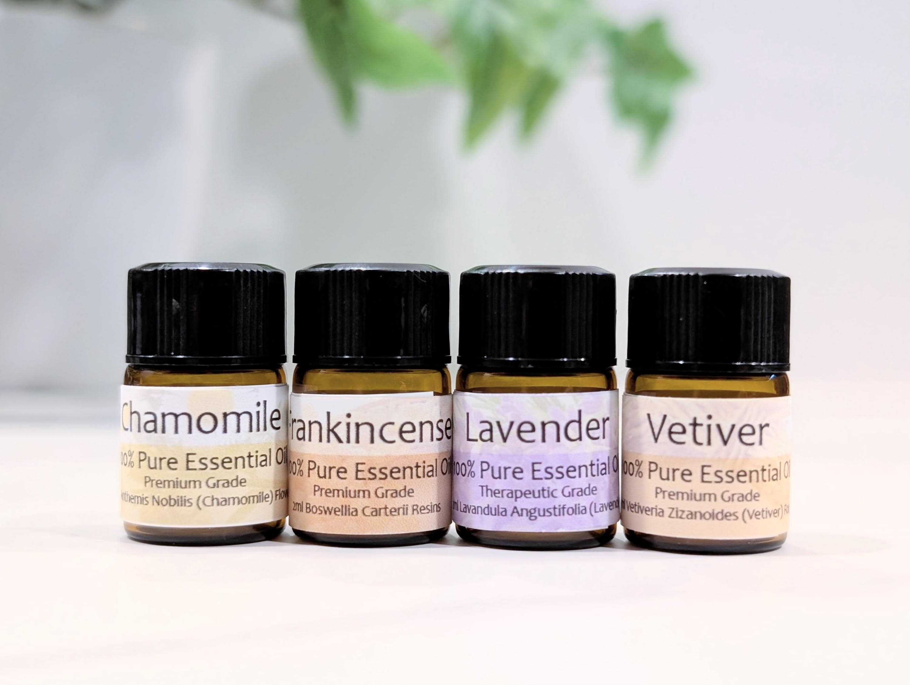 Set of four 2 ml sample bottles containing pure essential oils. Perfect for trying new aromas, refilling small diffusers, or carrying with you on the go.