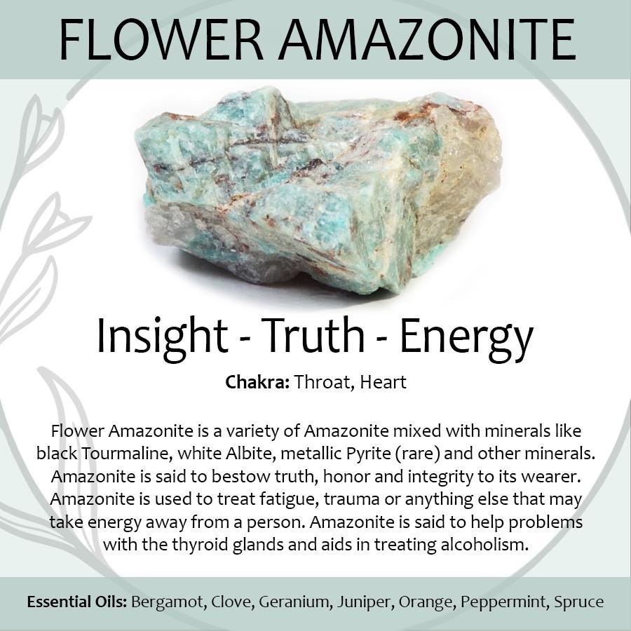 Flower Amazonite is a variety of Amazonite mixed with minerals like black Tourmaline, white Albite, metallic Pyrite (rare) and other minerals. Amazonite is said to bestow truth, honor and integrity to its wearer. Amazonite is used to treat fatigue, trauma or anything else that may take energy away from a person.
