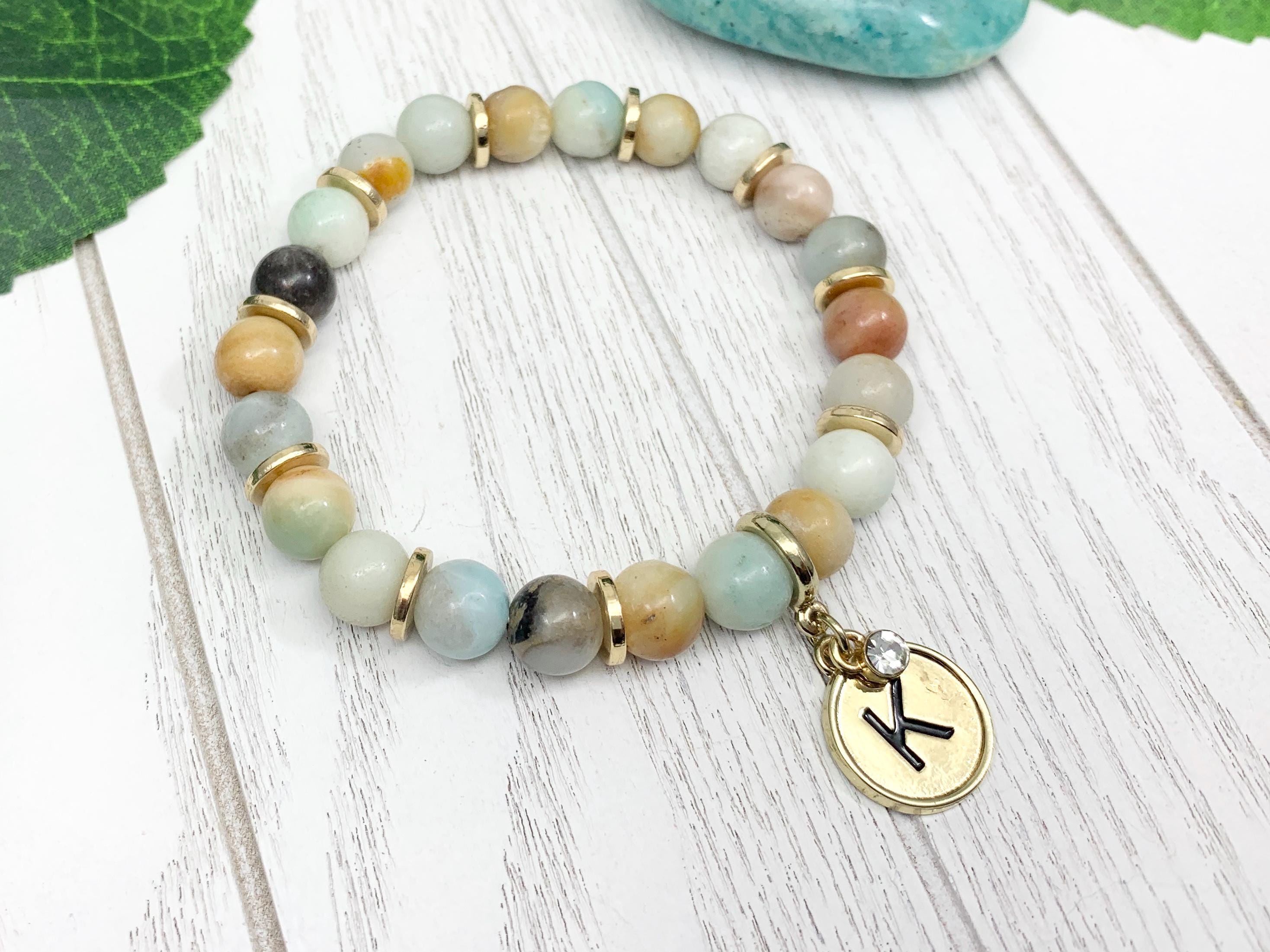 14 mm gold plated initial charm with dainty rhinestone, complemented by 8 mm polished gemstone beads.