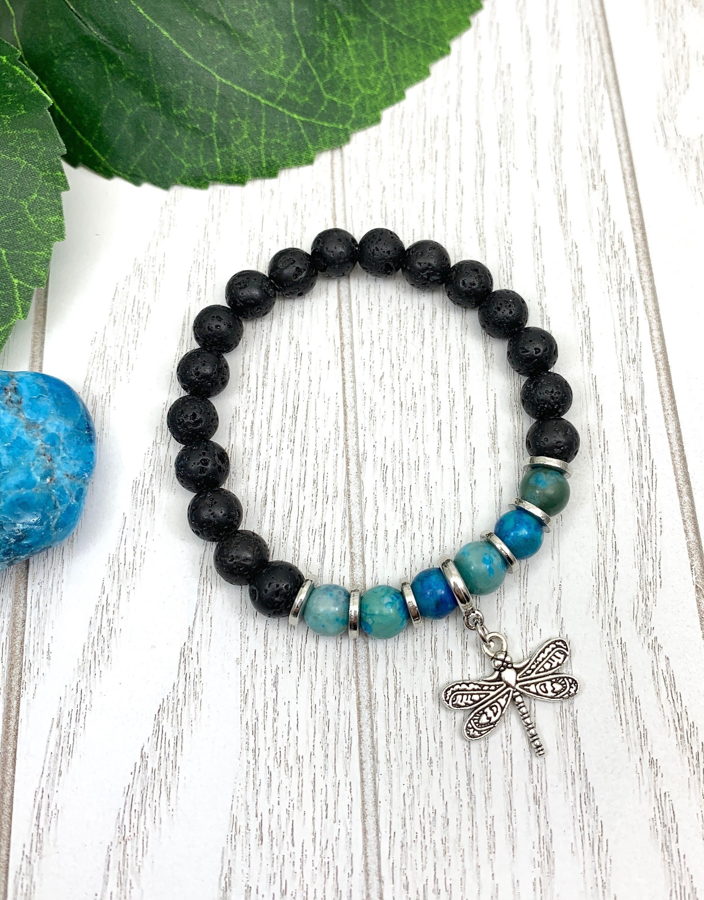 Bring gentle hope, confidence, and emotional harmony to your healing journey with this meaningful stretch bracelet. Six polished 8mm turquoise-blue Ripple Jasper beads are framed by grounding black lava rock beads, accented with silver spacers and a delicate silver-plated dragonfly charm.