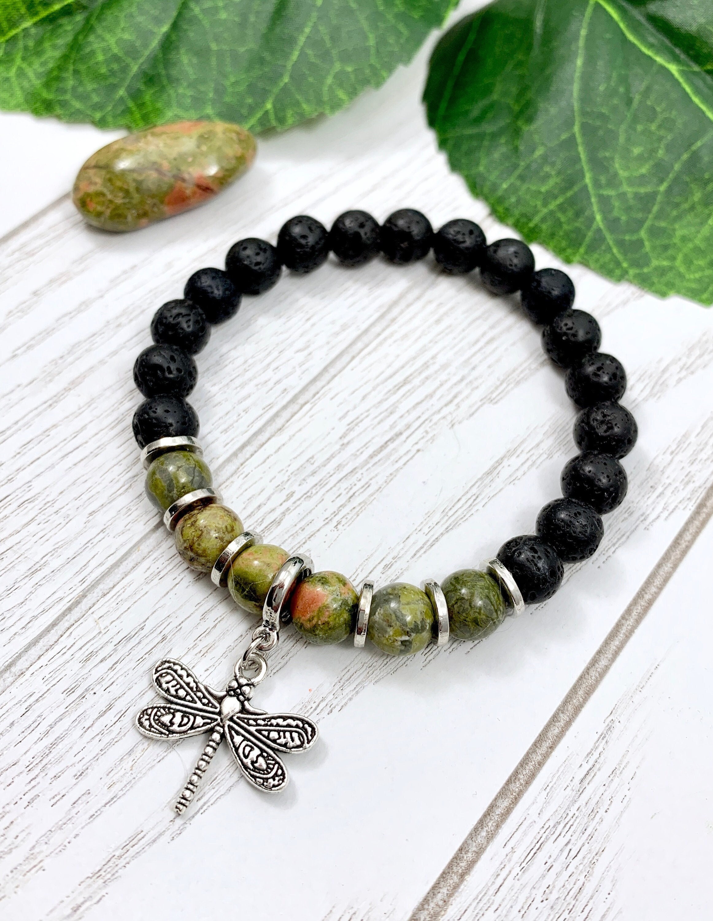 Beads: 8mm polished unakite (mossy green + peach tones) + dragonfly charm (0.5 inch)