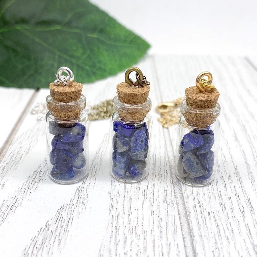 Minimalist Bottle Design: The glass vial pendant filled with lapis chips makes a unique, subtle statement. Perfect for every day or as a meaningful gift.