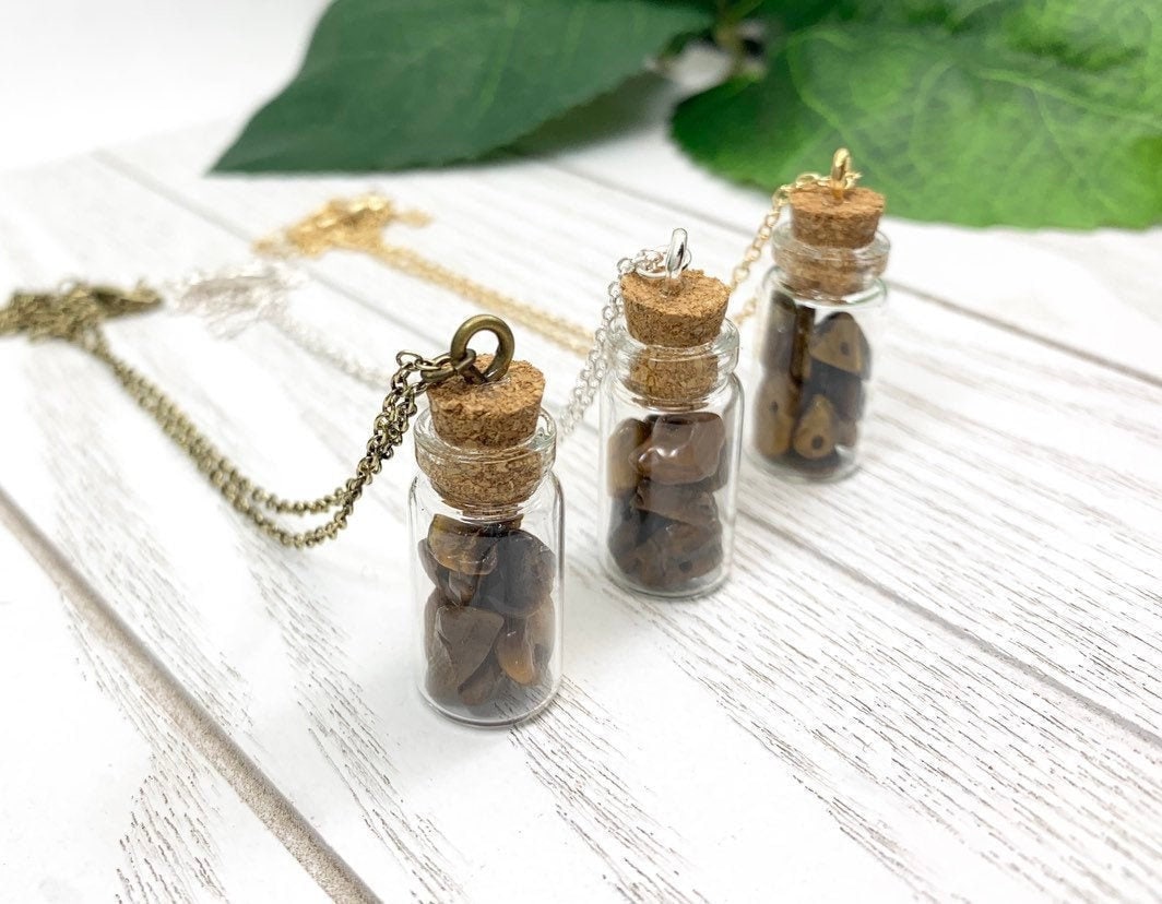 1.5-inch glass vial filled with 3-5mm tiger's eye chips on an 18-inch chain.