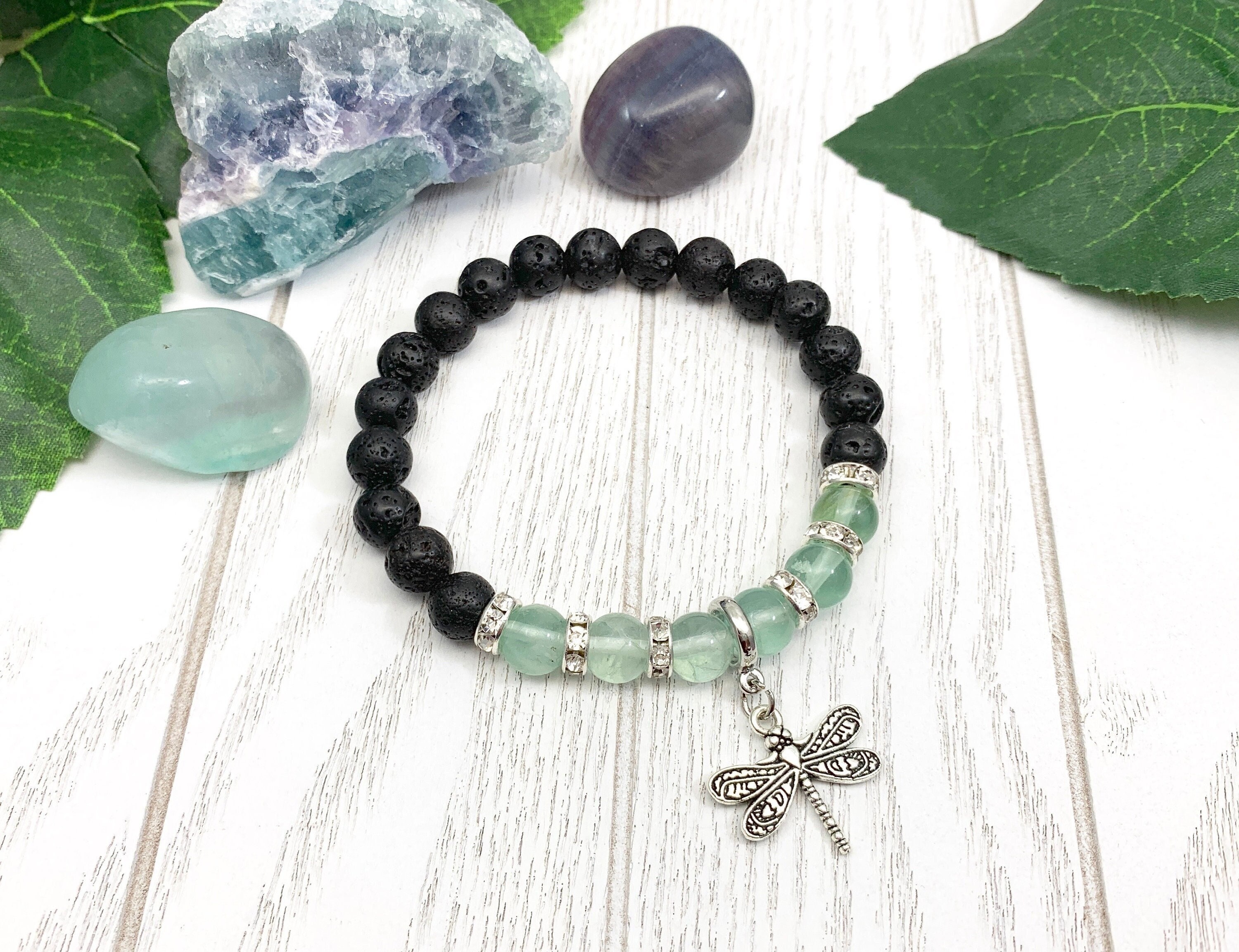 Six round 8mm green Fluorite beads with silver rhinestone spacers in between, surrounded by round black Lava Rock beads on an elastic bracelet. This bracelet features the special silver-plated dragonfly charm.