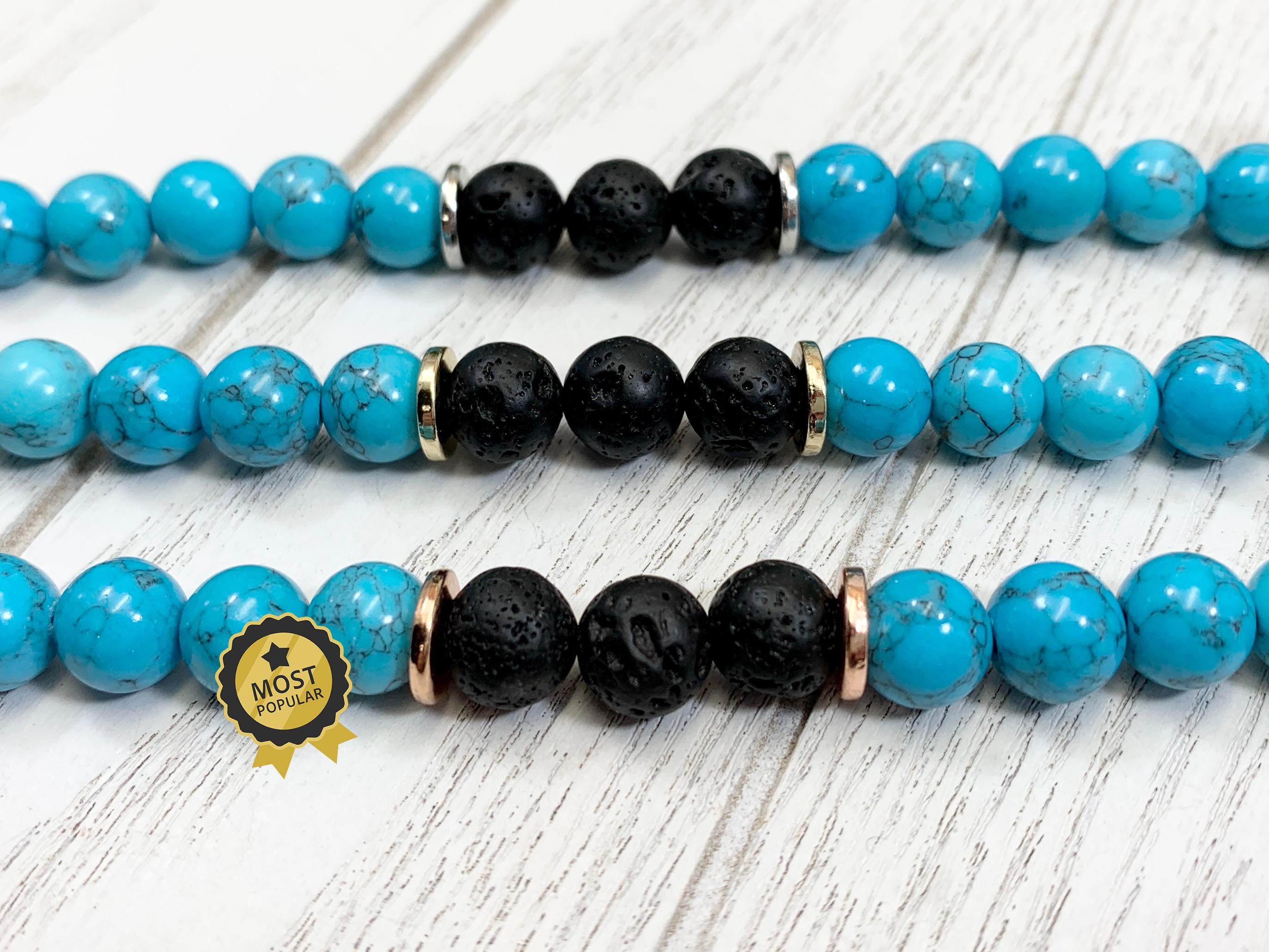 Beads: Alternating 8 mm polished turquoise howlite + matte black lava stones strung on durable elastic fiber.
