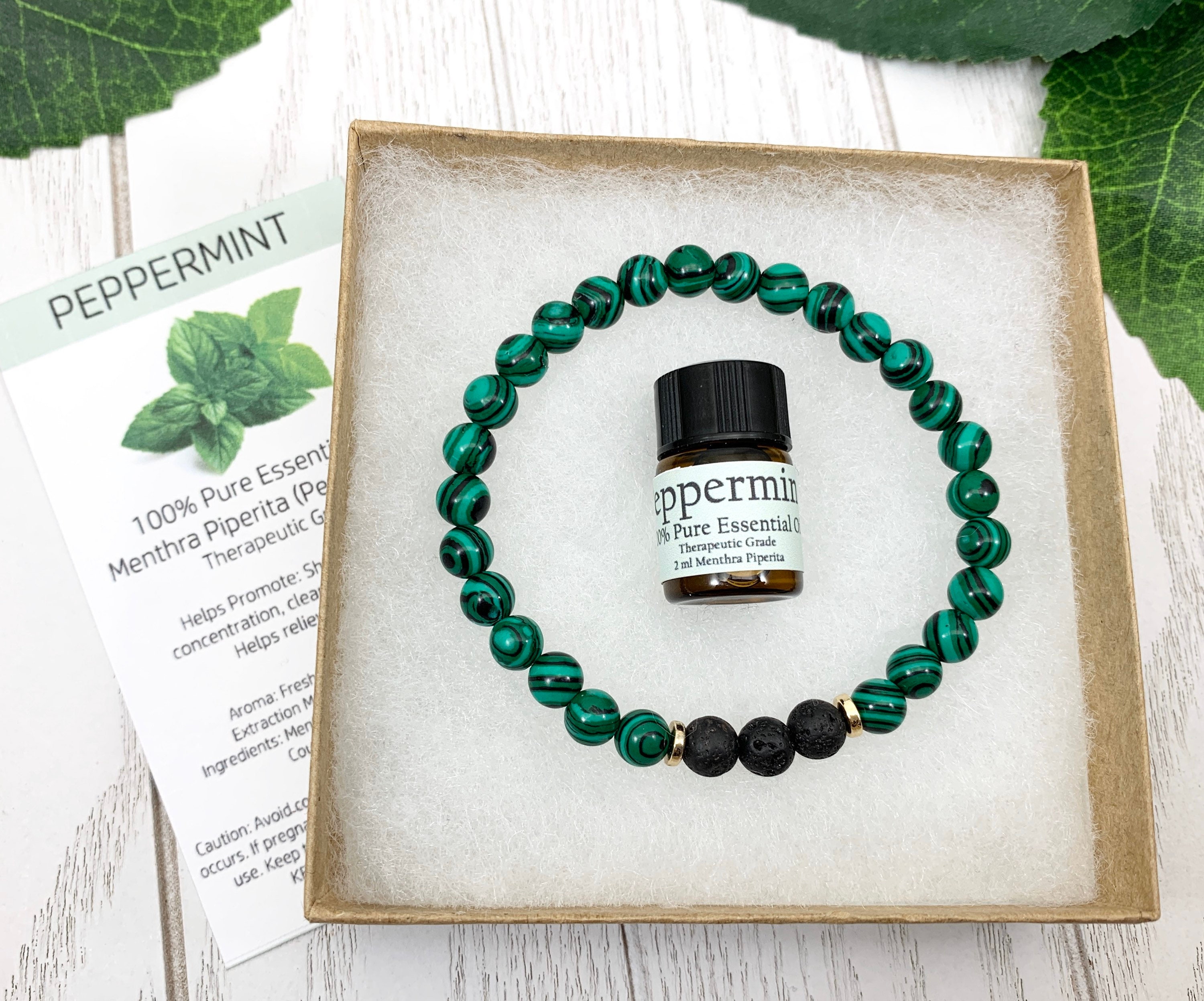 Beads: 6 mm polished (simulated) malachite stone(vibrant green swirls) + matte black lava stones strung on durable elastic fiber.