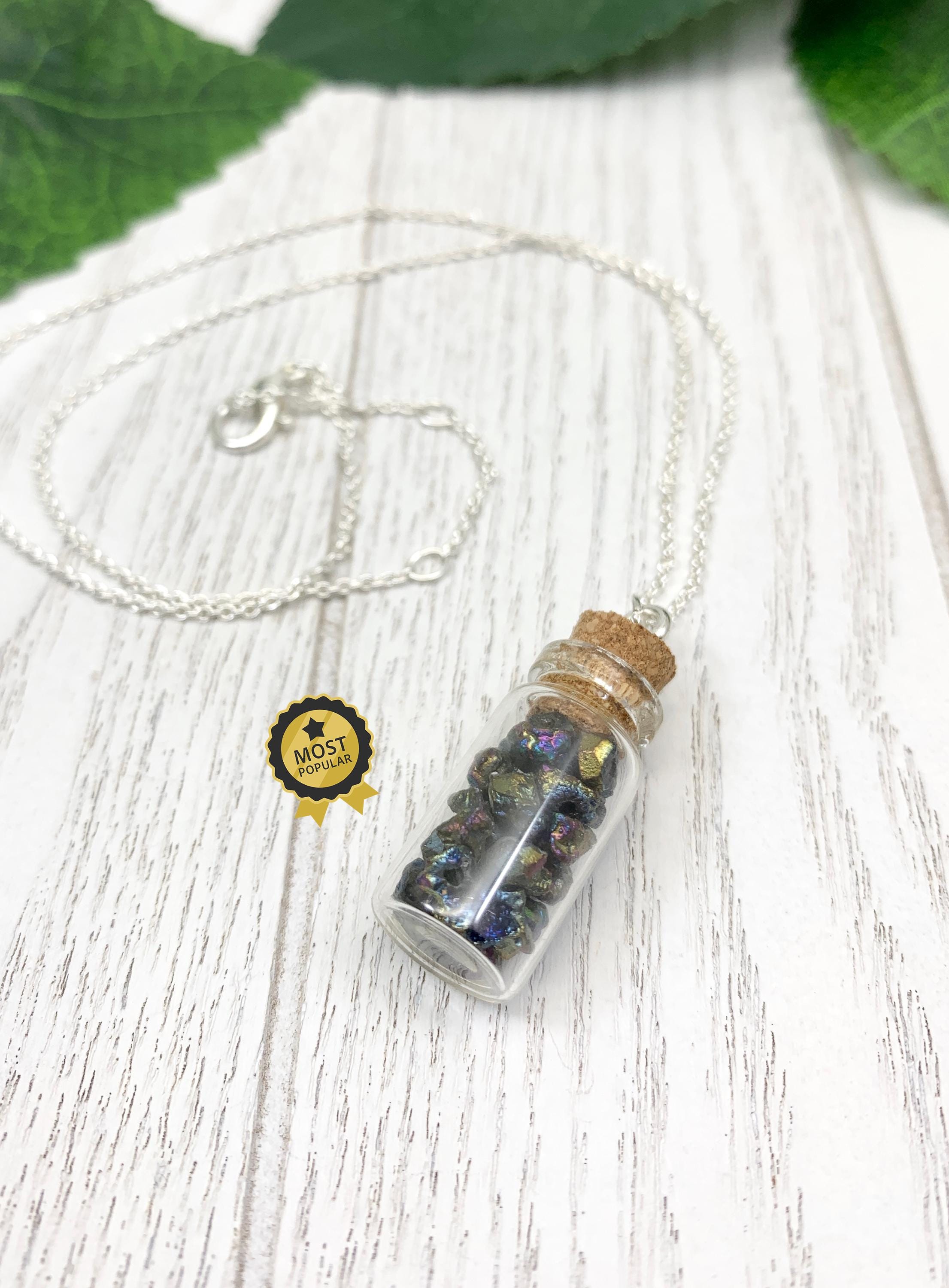 This Rainbow Aura Quartz Bottle Necklace features a clear glass vial filled with shimmering rainbow aura quartz chips. A wearable piece crafted for optimistic vibes, mindful presence, and subtle style.