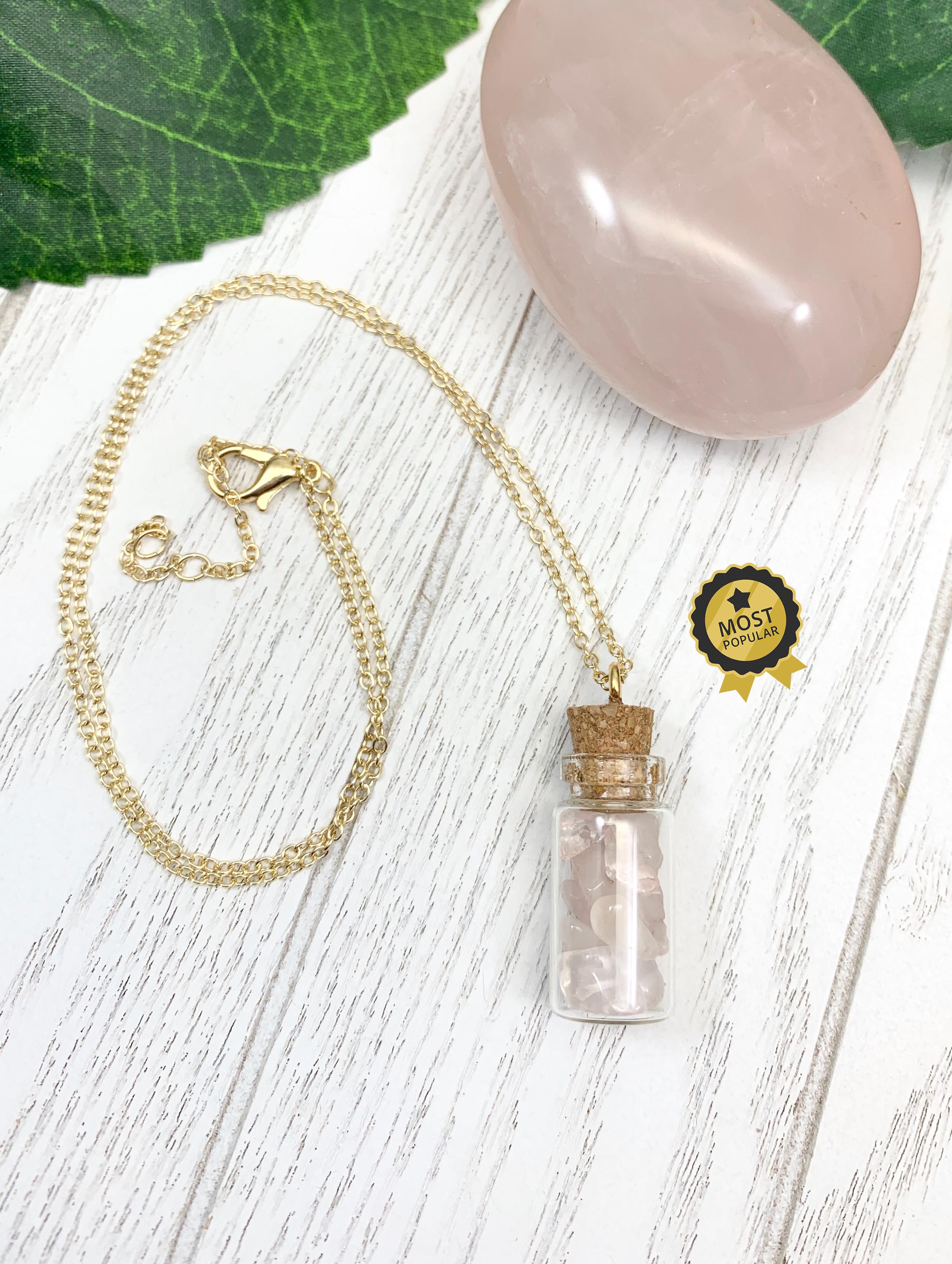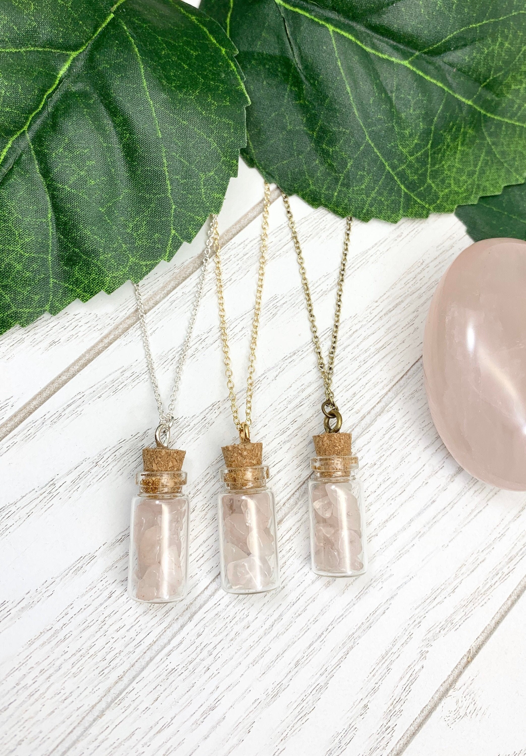 Pendant & Chain: A clear glass bottle pendant approximately 0.5β³ wide and 1.25β³ high, filled with genuine rose quartz chip beads, hanging on a delicate adjustable chain (16β³β18β³ length).