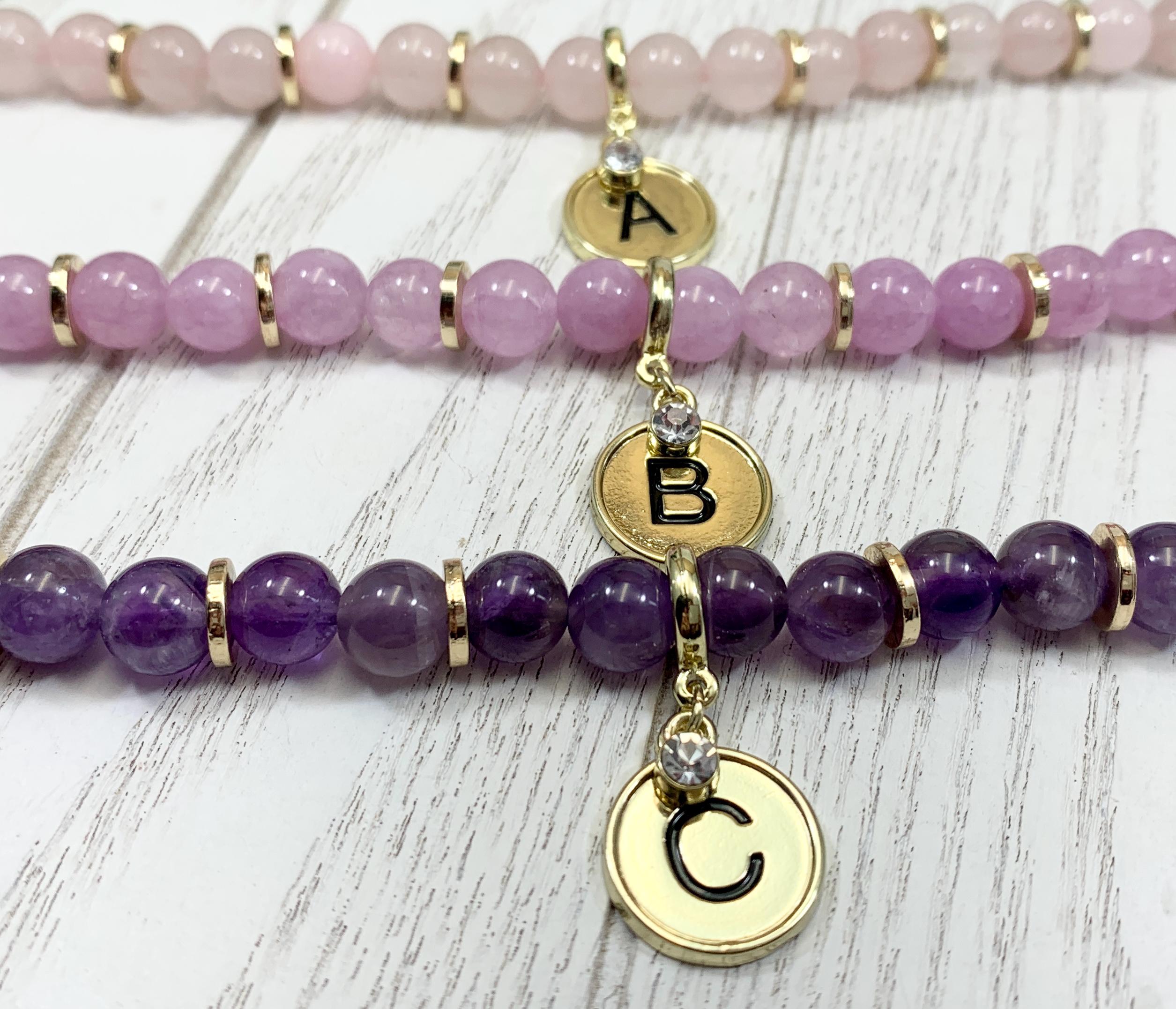 This Personalized Monogram Crystal Bracelet allows you to wear a custom initial charm paired with gemstone beads: a stylish keepsake and meaningful everyday piece.