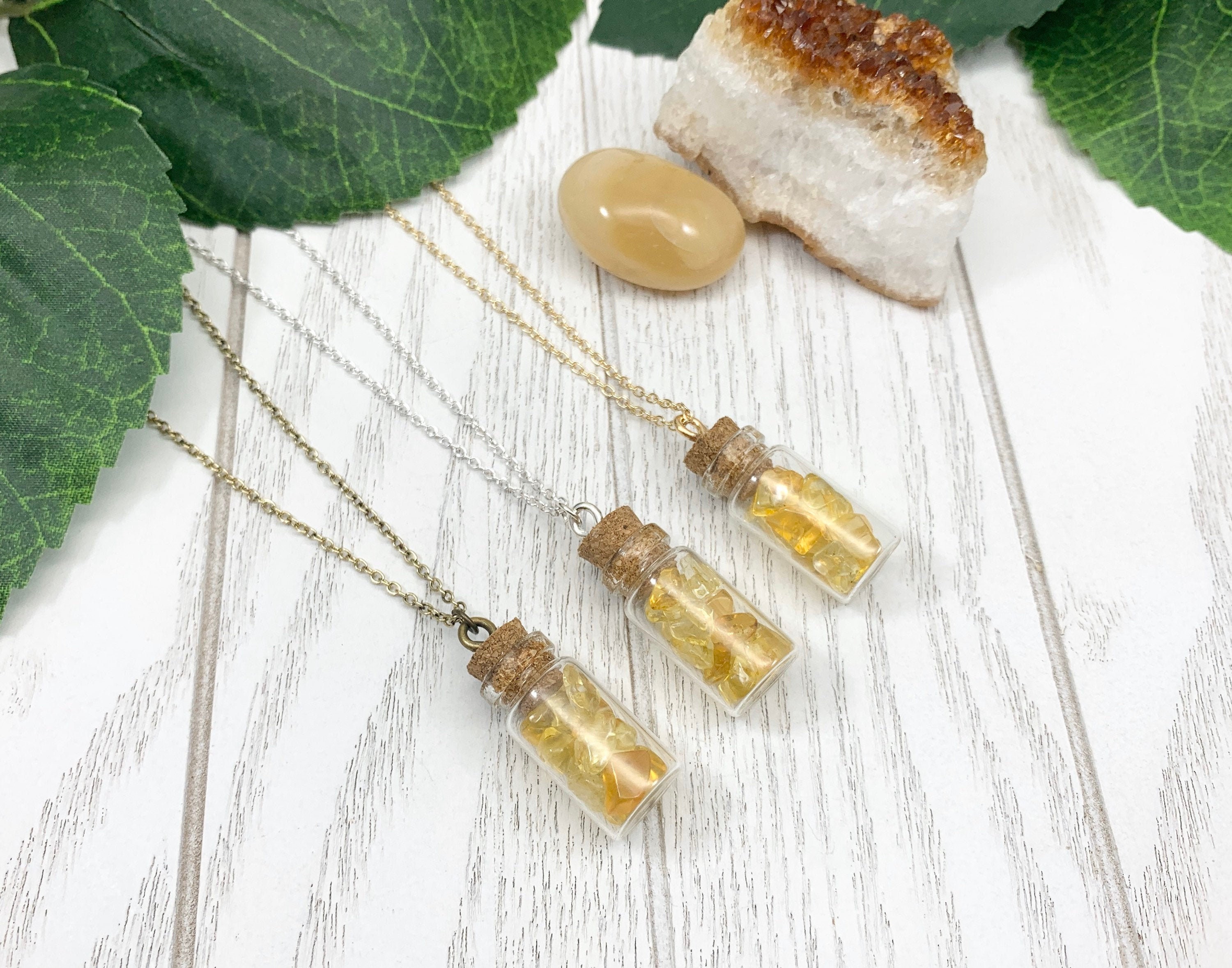 Clear glass bottle (0.5" width × 1.25" height) filled with genuine citrine chips, hung on a delicate chain with lobster claw clasp.