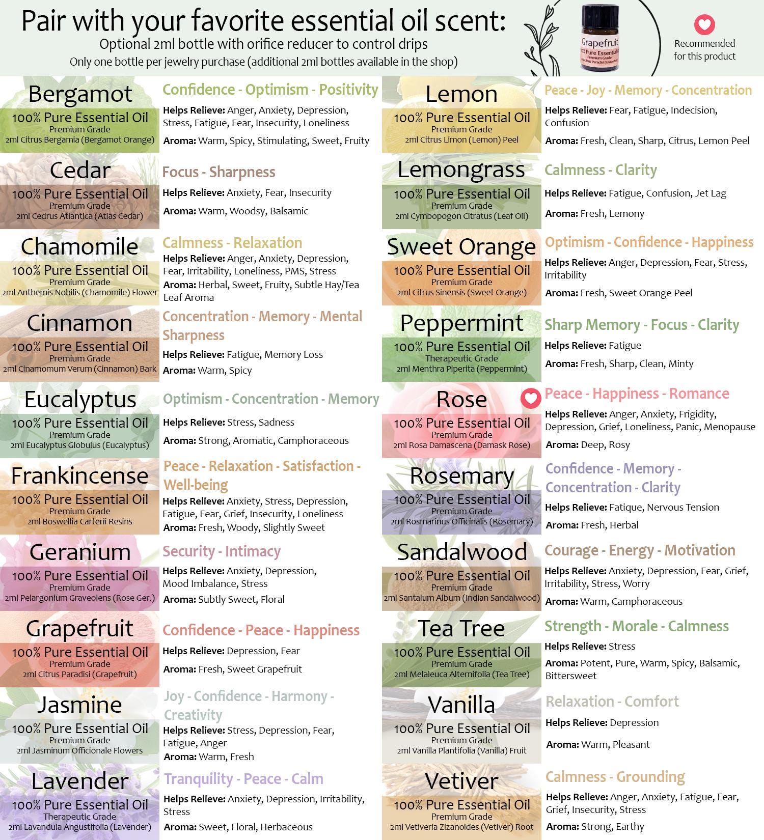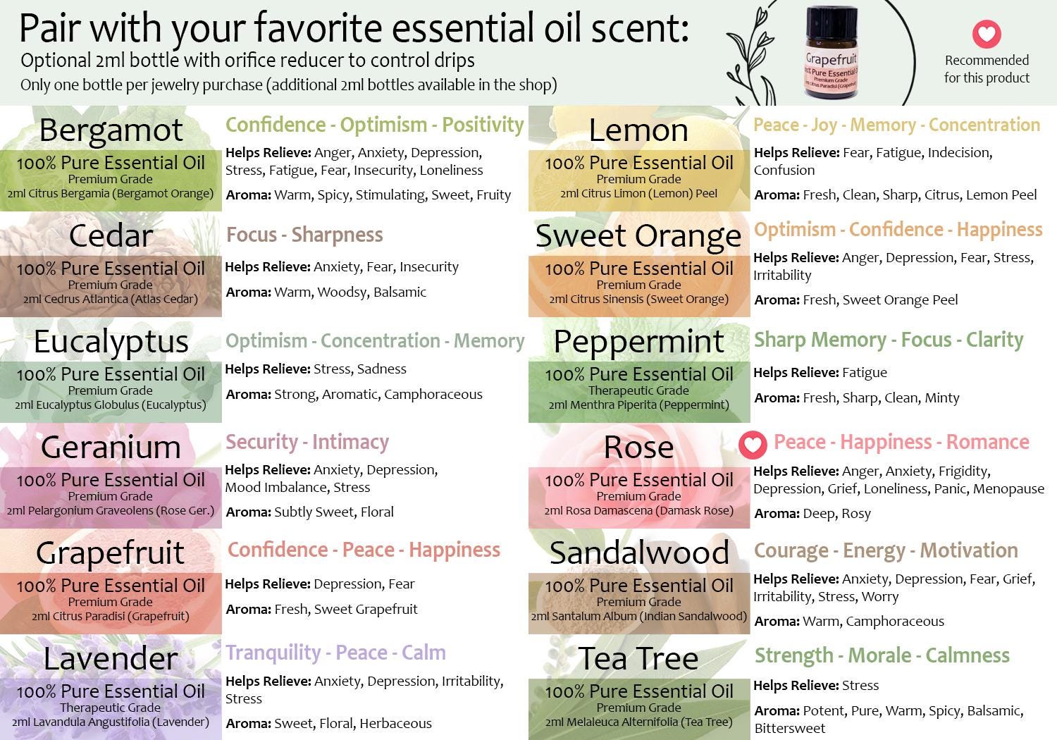 Optionally include a 2 ml dropper bottle of 100% pure essential oil. Apply 1–2 drops to lava beads only (do not oversaturate).