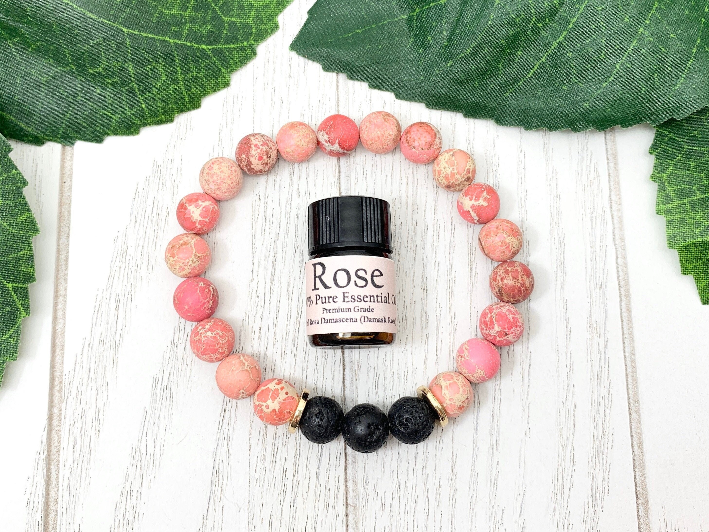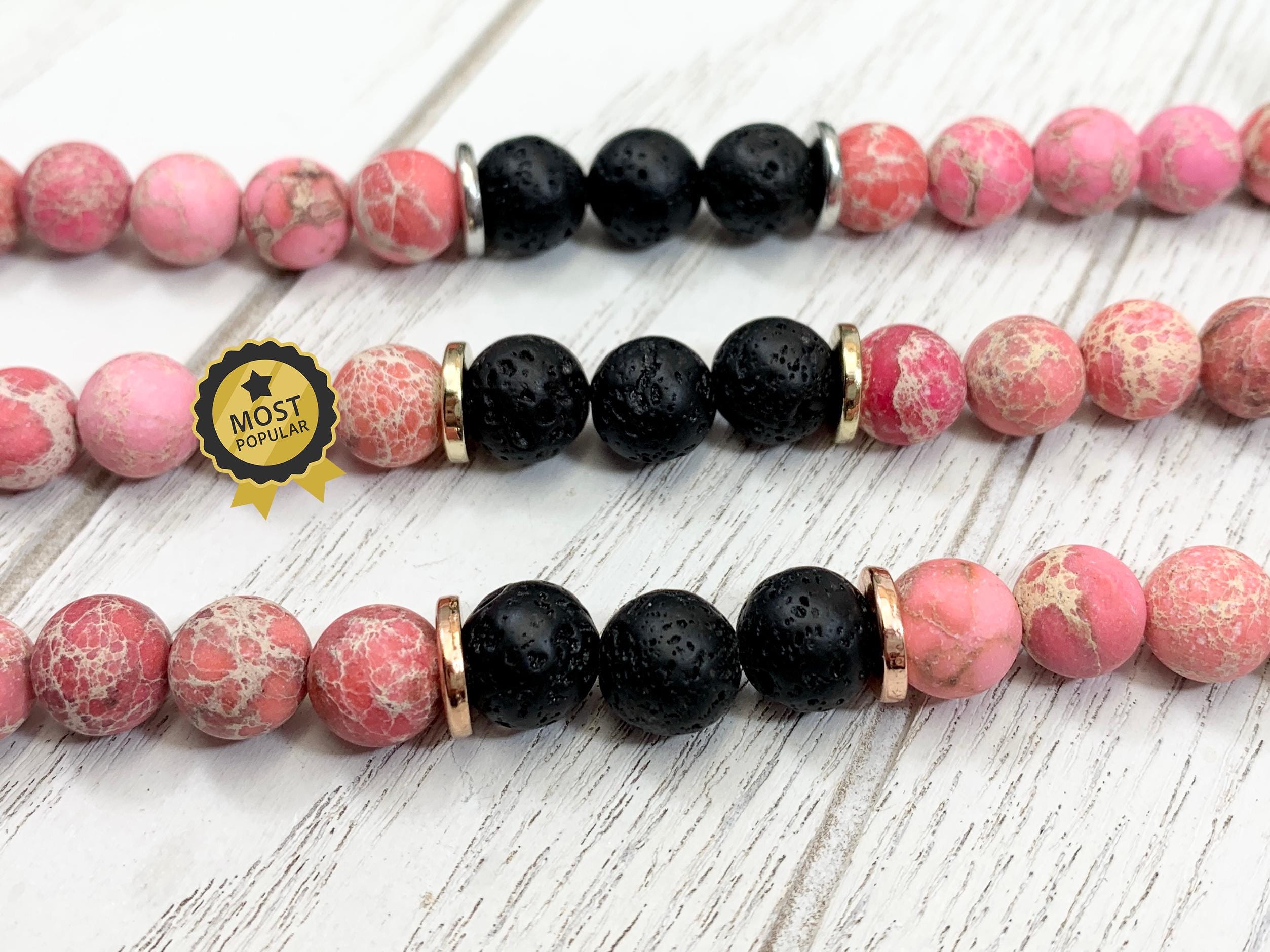 Matte 8 mm pink imperial jasper beads with lava rock diffuser beads and your choice of metal spacer accents.