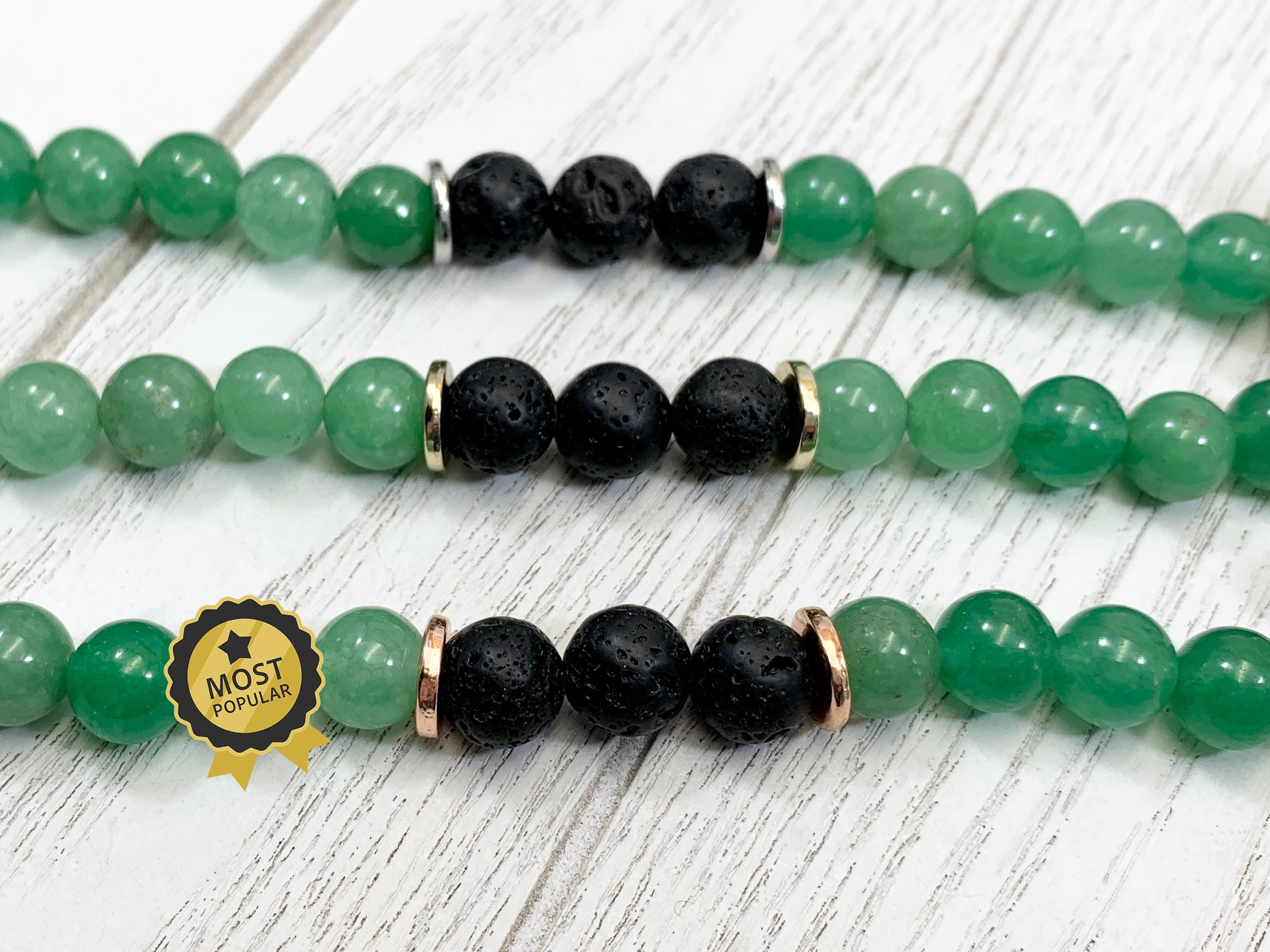 Beads: Alternating 8 mm polished green aventurine + matte black lava stones strung on durable elastic fiber.