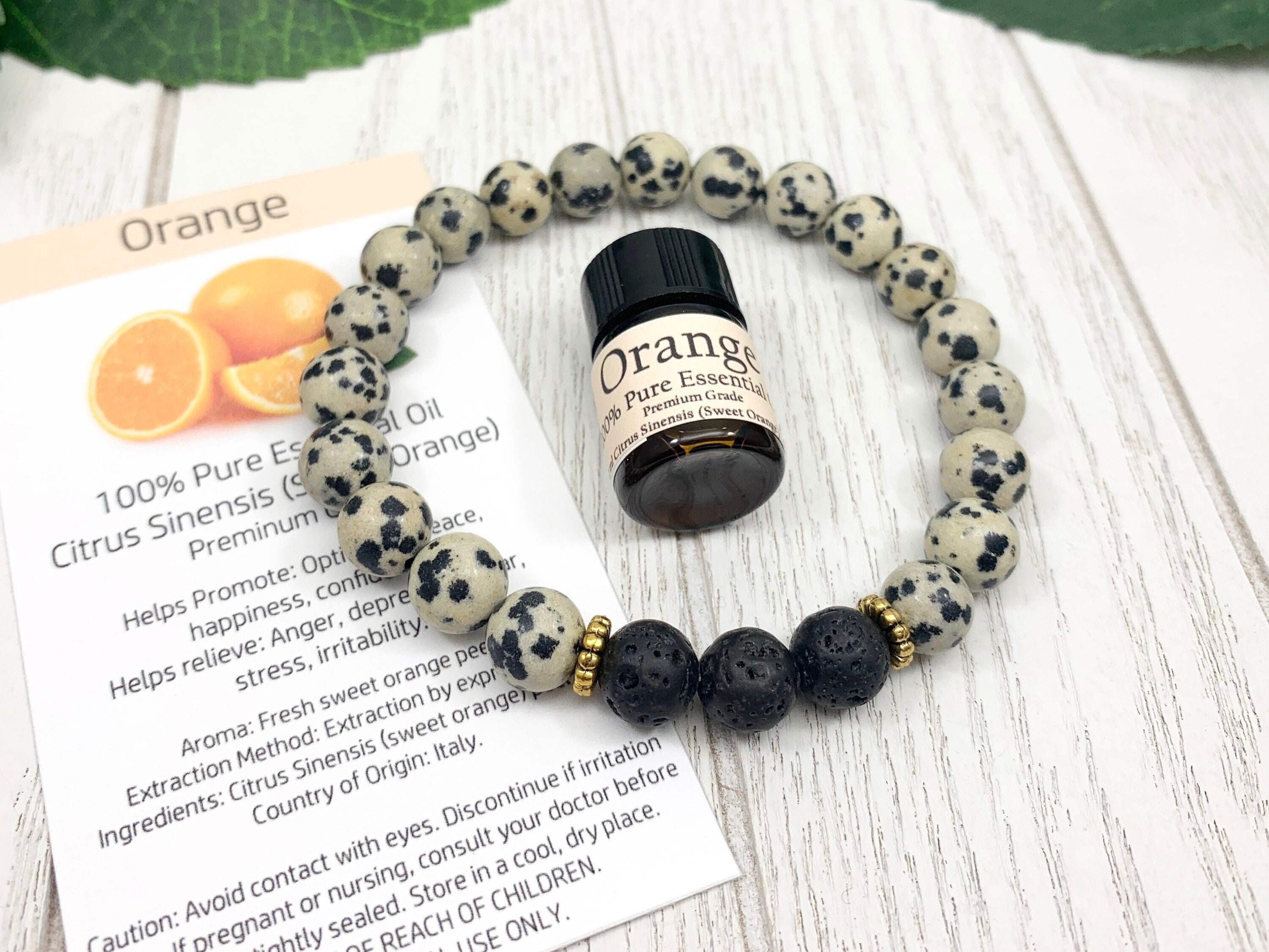 The perfect essential oil diffuser bracelet gift for self-healing and care for him or her. A great grounding bracelet with polished round 8mm spotted black and beige Dalmatian Jasper stone beads on an elastic fiber cord, featuring three black 8mm Lava Rock diffuser beads in between two spacer beads of your choice.